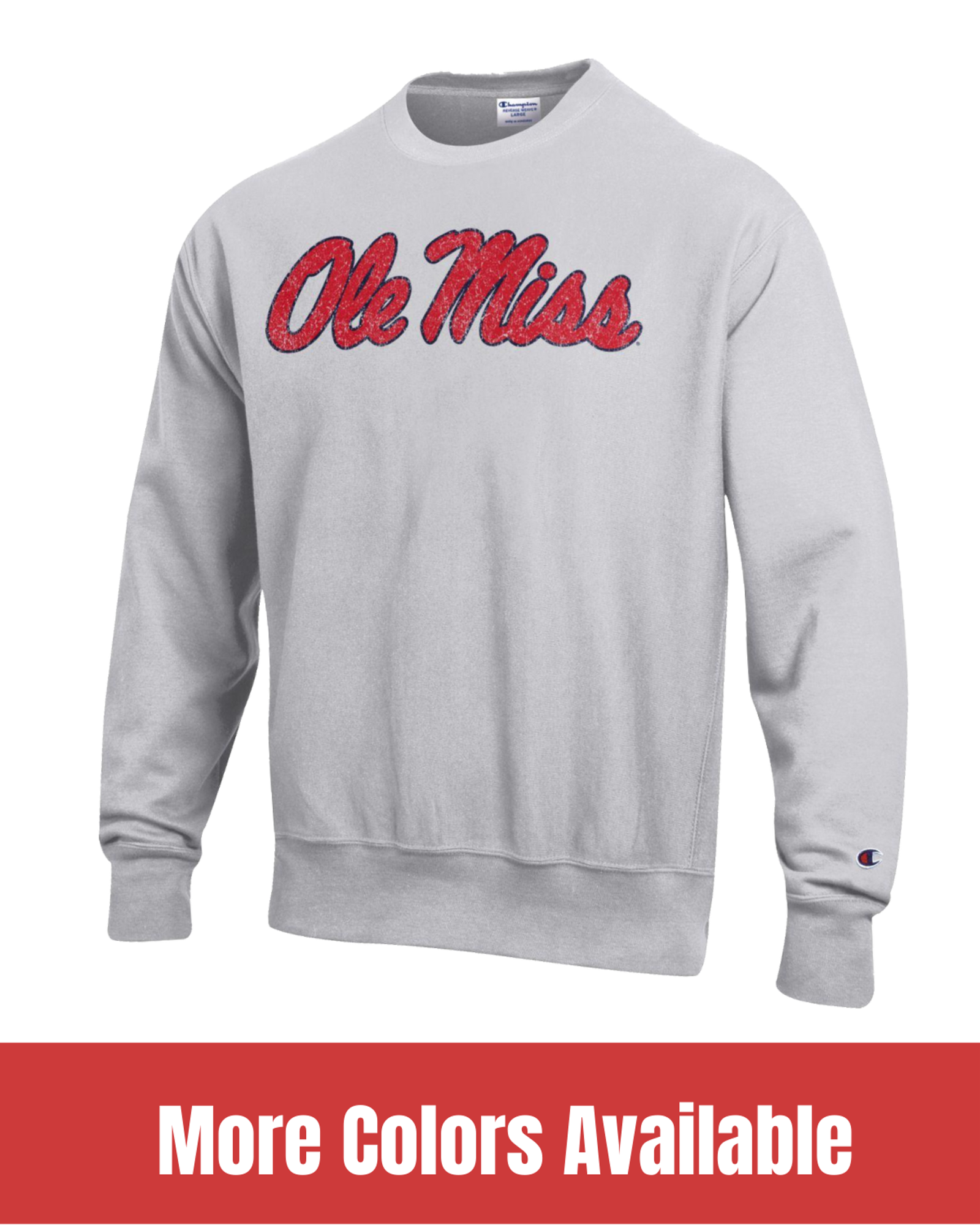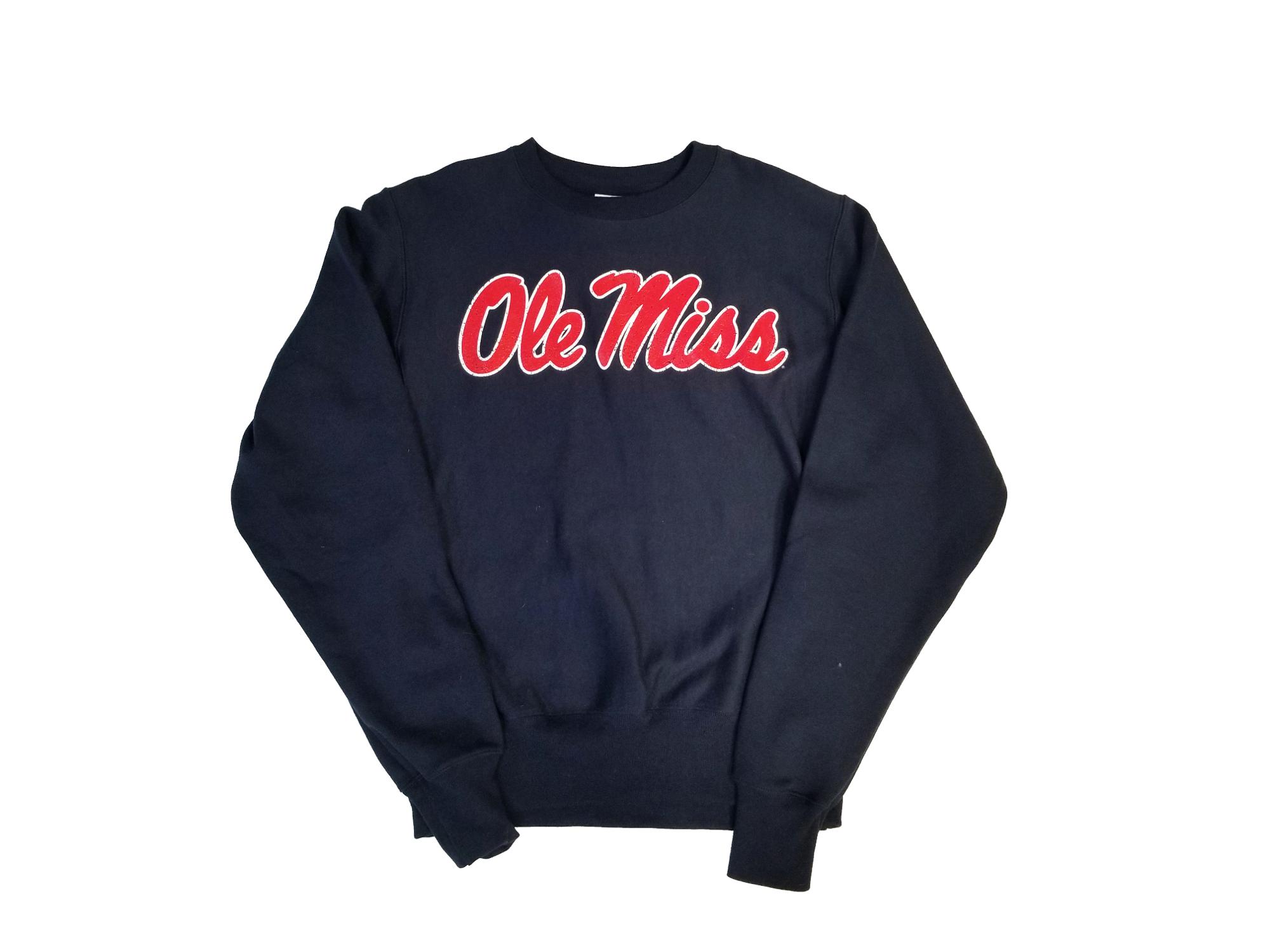 Unisex fit. Distressed print. Heavyweight fabric with ribbed side panels. 82% cotton, 18% polyester. This crew has some serious retro style. Years ago, its predecessors were used for football jerseys. You'll know you're wearing a little piece of history the next time you put on this Ole Miss sweatshirt.