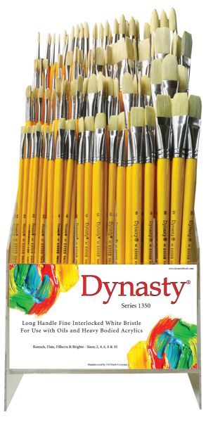 Dynasty 1350 Series is an intermediary brush program for oils and acrylics. Made from long white birch lacquered bright yellow handles and seamless ferrules that are glued and double crimped to ensure adhesion and long lasting capabilities. The finest pure white bristle was designed with our proprietary Interlocked bristle technology to offer durability and control. This program is a strong brush for the collegiate artist.