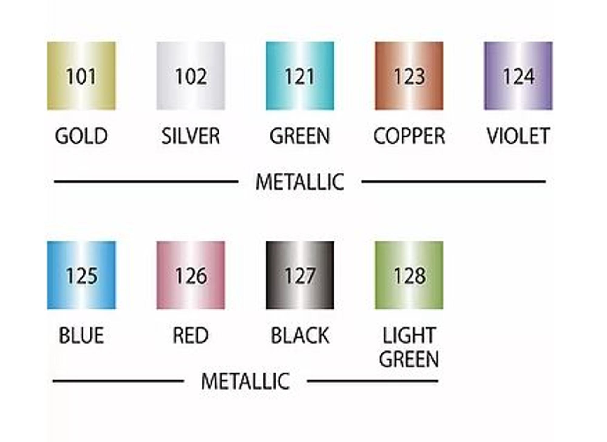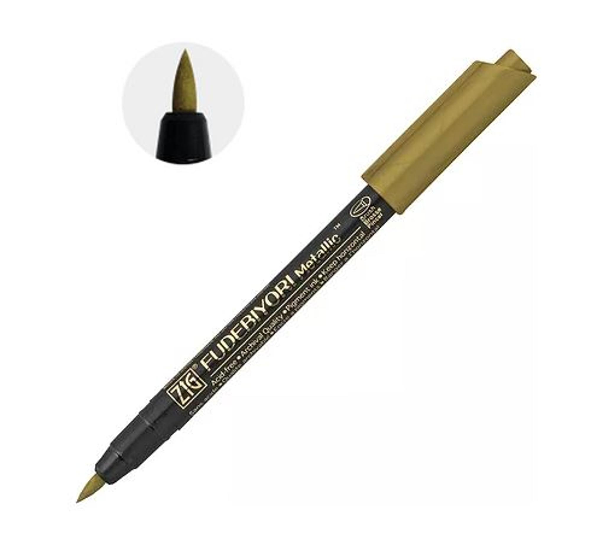 Popular brush pen with water-based metallic pigment ink. Available in black, blue, copper, gold, green, light green, red, silver, and violet.