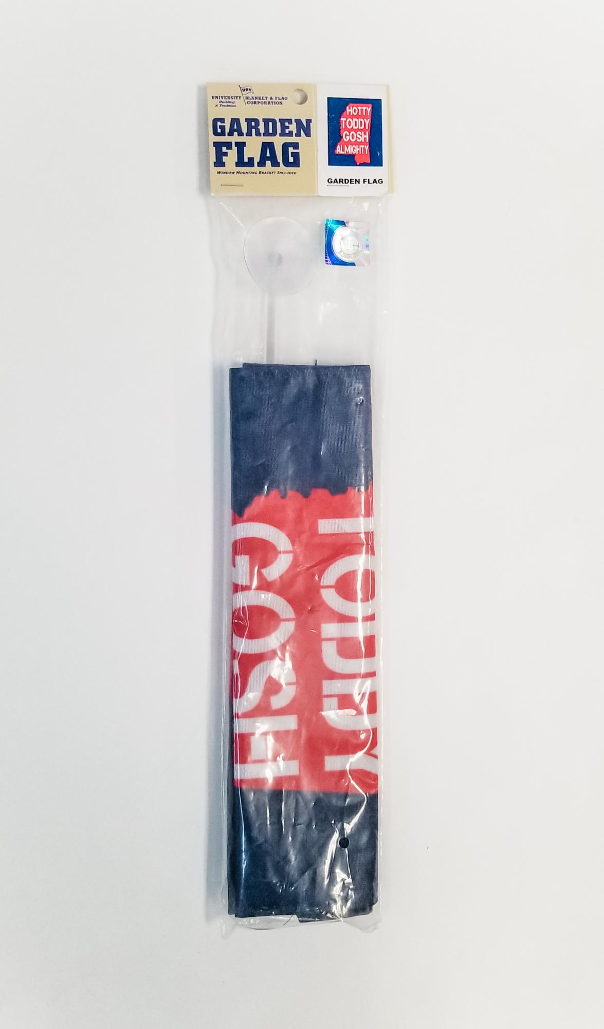 This 12x15 Hotty Toddy Gosh Almighty 2-ply garden flag is durably constructed and easy to use. It is sleeved across the top to hang from a standard garden flag pole OR display it in your window. A plastic rod with suction cups is included in the package. It can be used to mount the flag to a window or any smooth surface. Give the Ole Miss Rebels a cheer when you display this attractive garden flag. CLEARANCE priced--originally $15.99.
