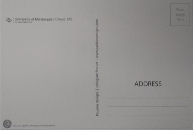 Standard size postcard depicts The Lyceum at Ole Miss. The Lyceum is the most recognizable academic building at The University Mississippi.