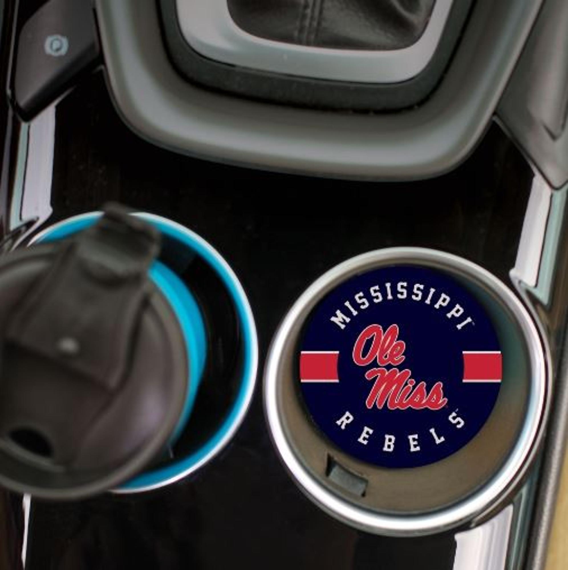 2.75'' W x 2.75'' H. Utilize this car coaster to support your Ole Miss Rebels all season long. Functional and filled with school spirit, this absorbant stone car coaster keeps your vehicle console dry. Each piece includes a convenient slanted edge, allowing for easy removal for cleaning.