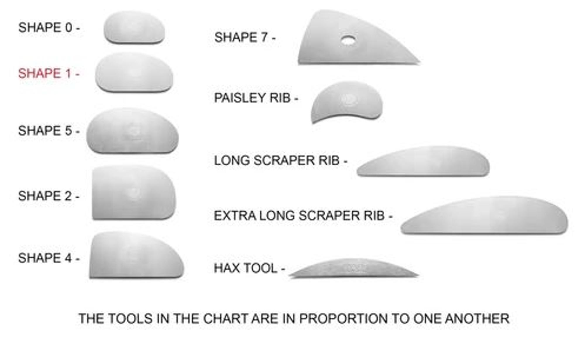 Shape 1 is a traditional kidney-shaped rib, probably the most universally recognized pottery tool. It fits well in the hand and is useful for sculpting, hand building and throwing clay. Shape 1 is not too big, not too small. It's just right.