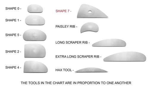 Here is a rib that stands firm. Made of a heavier grade stainless steel, Shape 7 has less flexibility than some of the other ribs. The blunt end is good for carving away material or removing waste clay on the wheel.