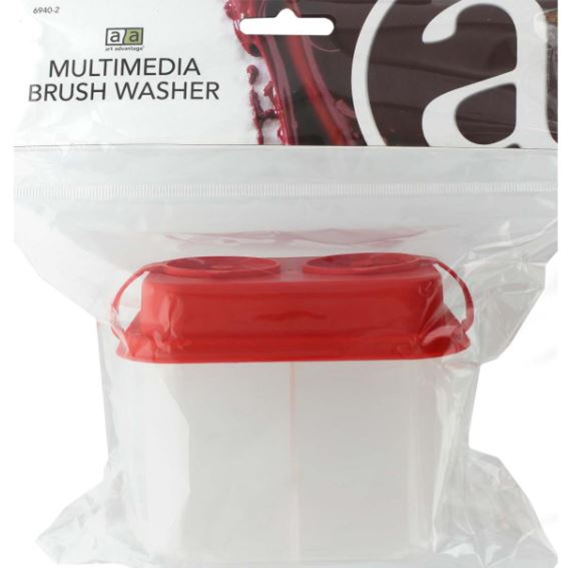 Art Advantage Double Water Cup With Lid - Brush washer with 2 compartments. Use one for cleaning and one for rinsing. Works for water when using watercolor or acrylic paints, but also works for different oils when using oil paints. Lid fits securely but is easy to take off and has a separate closure for each compartment. Measures approximately 4"x 3.25"x 3.5".