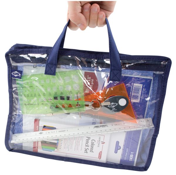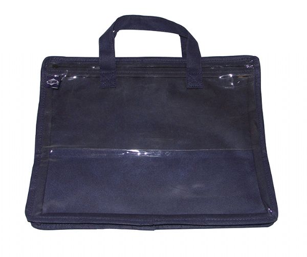 Made of durable, dark blue nylon fabric with a translucent PVC vinyl front to clearly see all items in the case. Each bag also has a clear inner pocket that is 5" deep with its own separate zipper to hold smaller items. Features a 3/4" gusset for bulkier items and a handle for easy portability. Content size: 10" x 13".