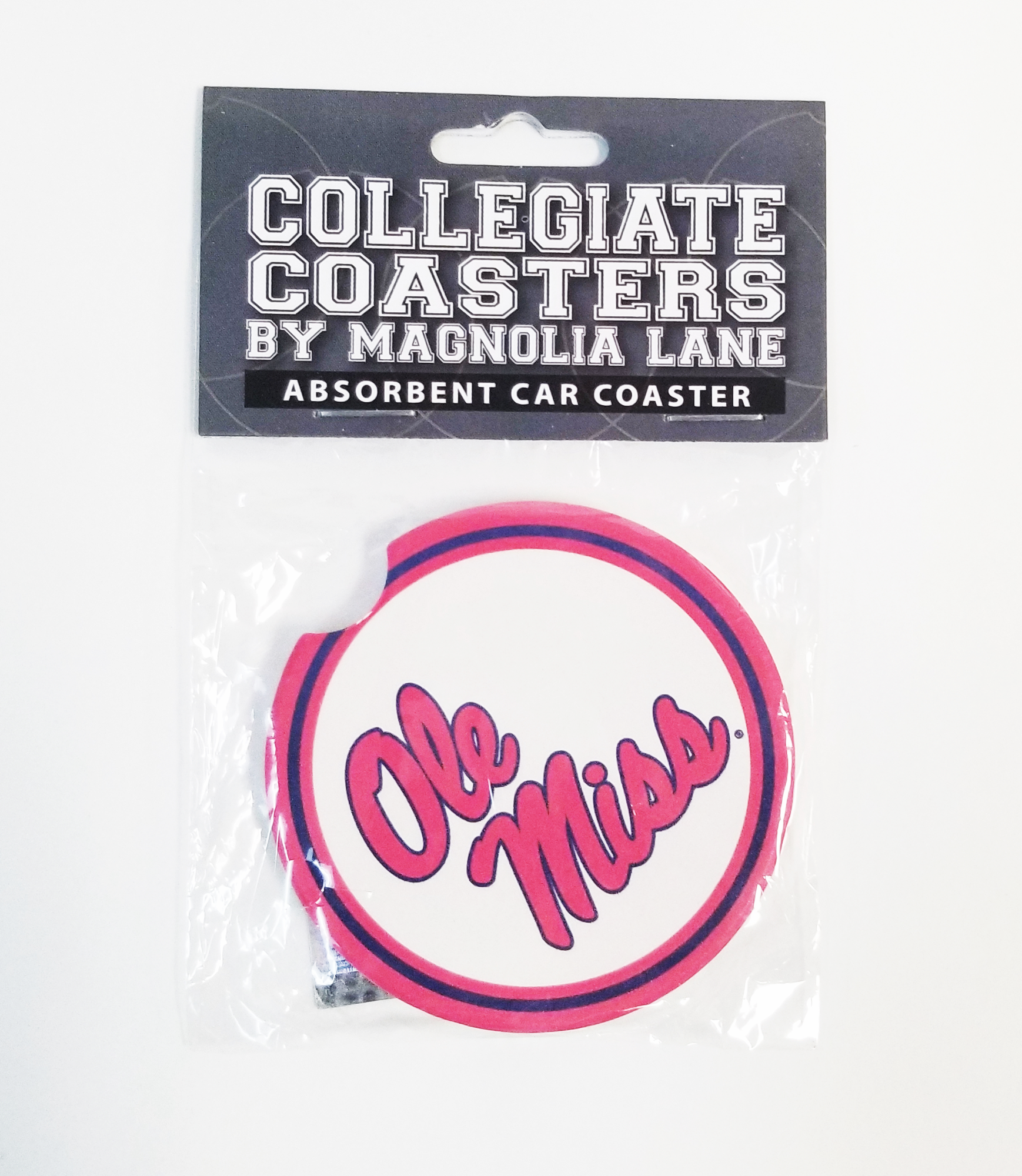 Absorbent stone coasters--pack of two. Notch for easy removal from auto cupholders. Useful way to bring some Ole Miss decor to your vehicle!