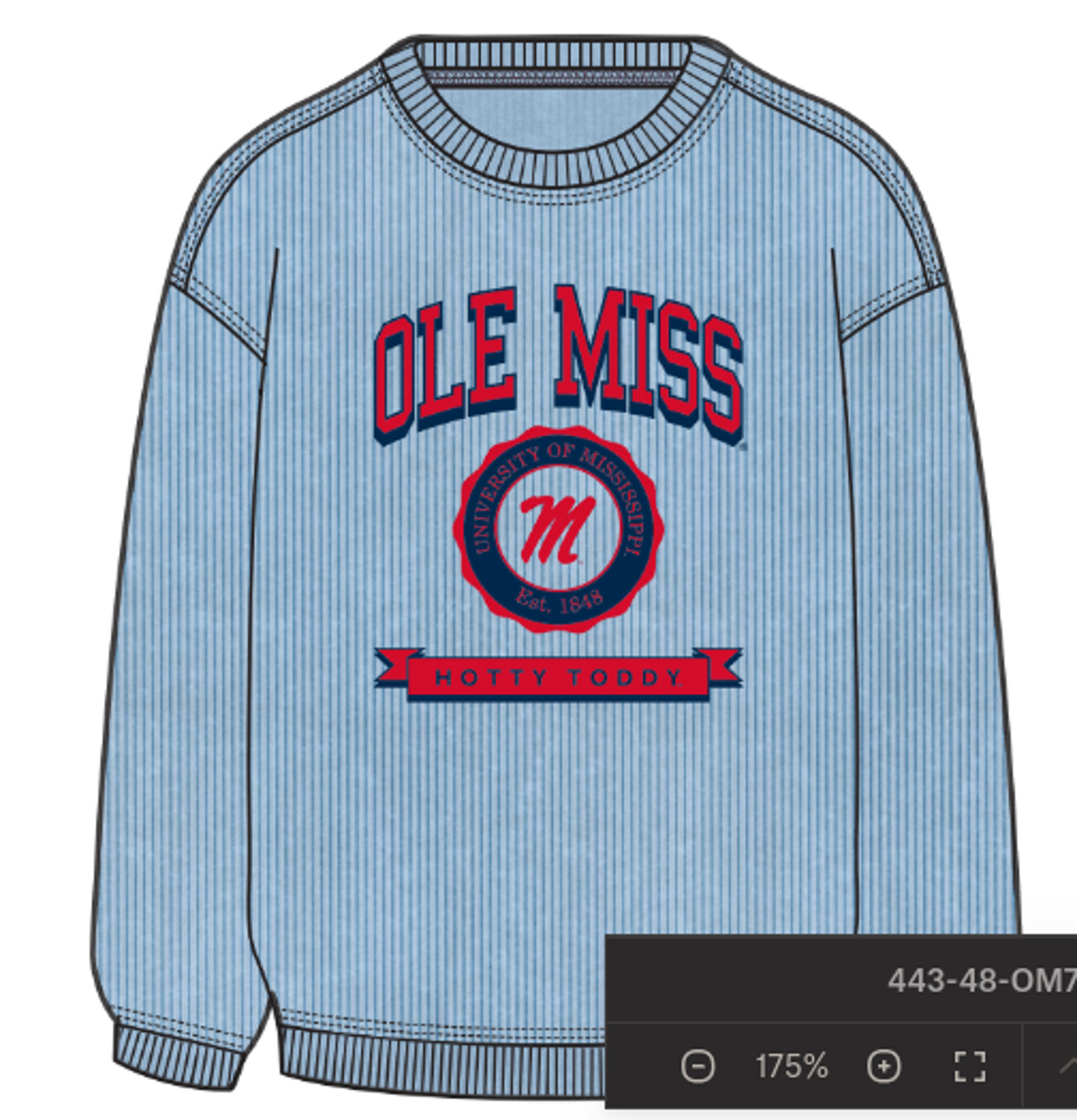100% cotton. Oversized sweatshirt with a super soft, vintage wash corded fabric. Features a ribbed crew neckline, cuffs, and hemline. The scholastic-style art features an arched Ole Miss on the top and a banner with Hotty Toddy on the bottom. The center medallion features a script M surrounded by Oxford, Mississippi and Established 1848.