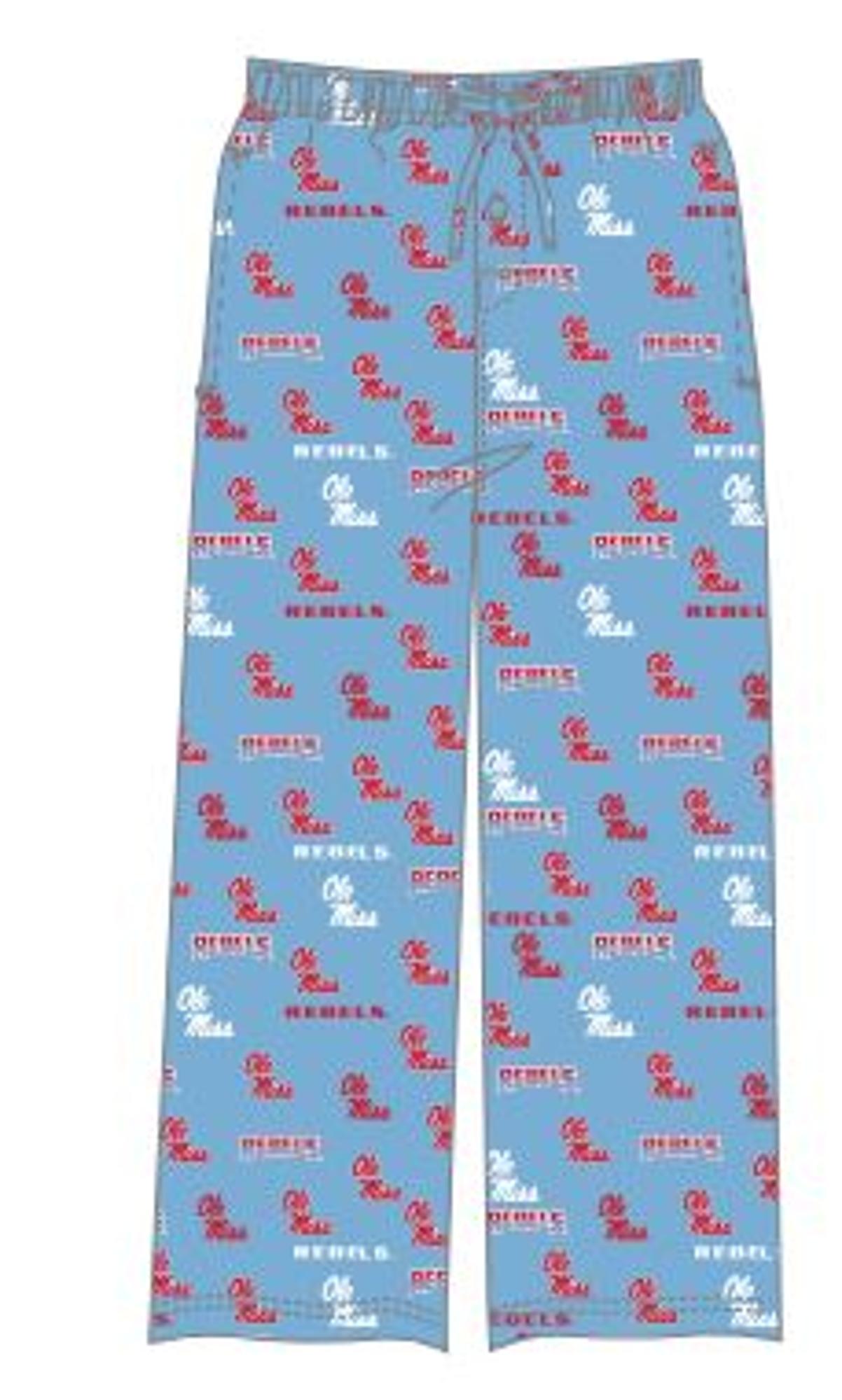 92% polyester, 8% spandex. Powder blue knit pants with overall Ole Miss Rebels print in red and white. Elastic waist with drawstring. On-seam pockets. Perfect gift for someone who eats, sleeps, and breathes Ole Miss!