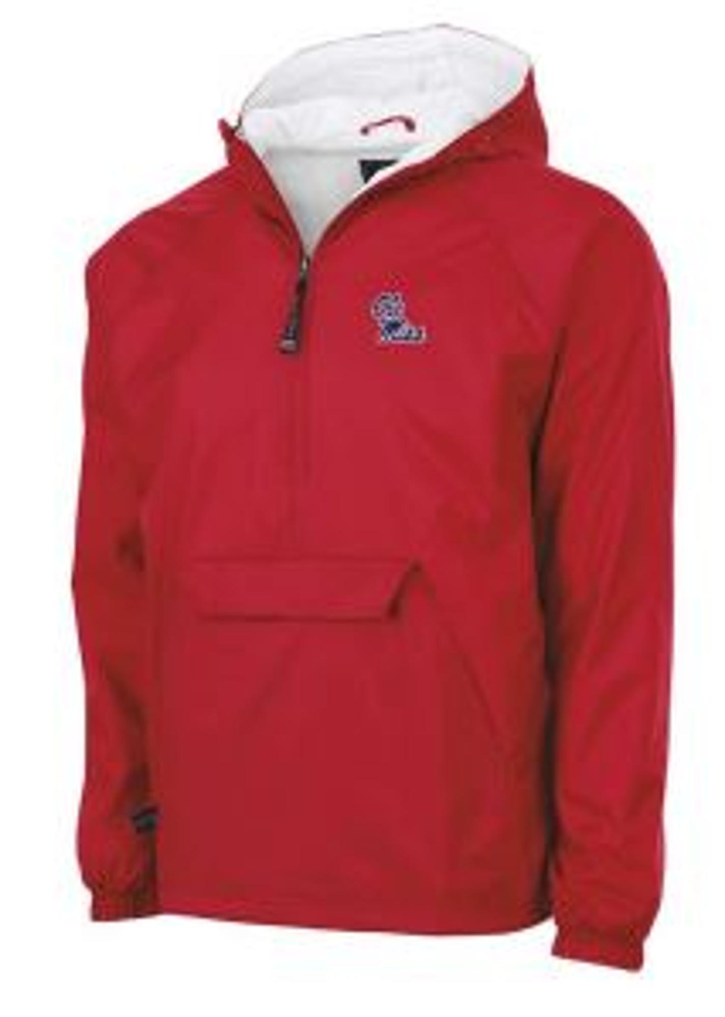 100% River Tec™ Nylon Taffeta. Lined with 100% cotton flannel for added comfort and warmth. Wind & water-resistant fabric offers protection from the elements. Lightweight & packs into its own pouch pocket for traveling on the go. Hood with adjustable shock cord drawstring. Elasticized cuffs and an adjustable shock cord hem. Unisex fit. Cozy pullover is great for a cool day on the Ole Miss campus. Easy to carry and easy to wear. Perfect for game days!