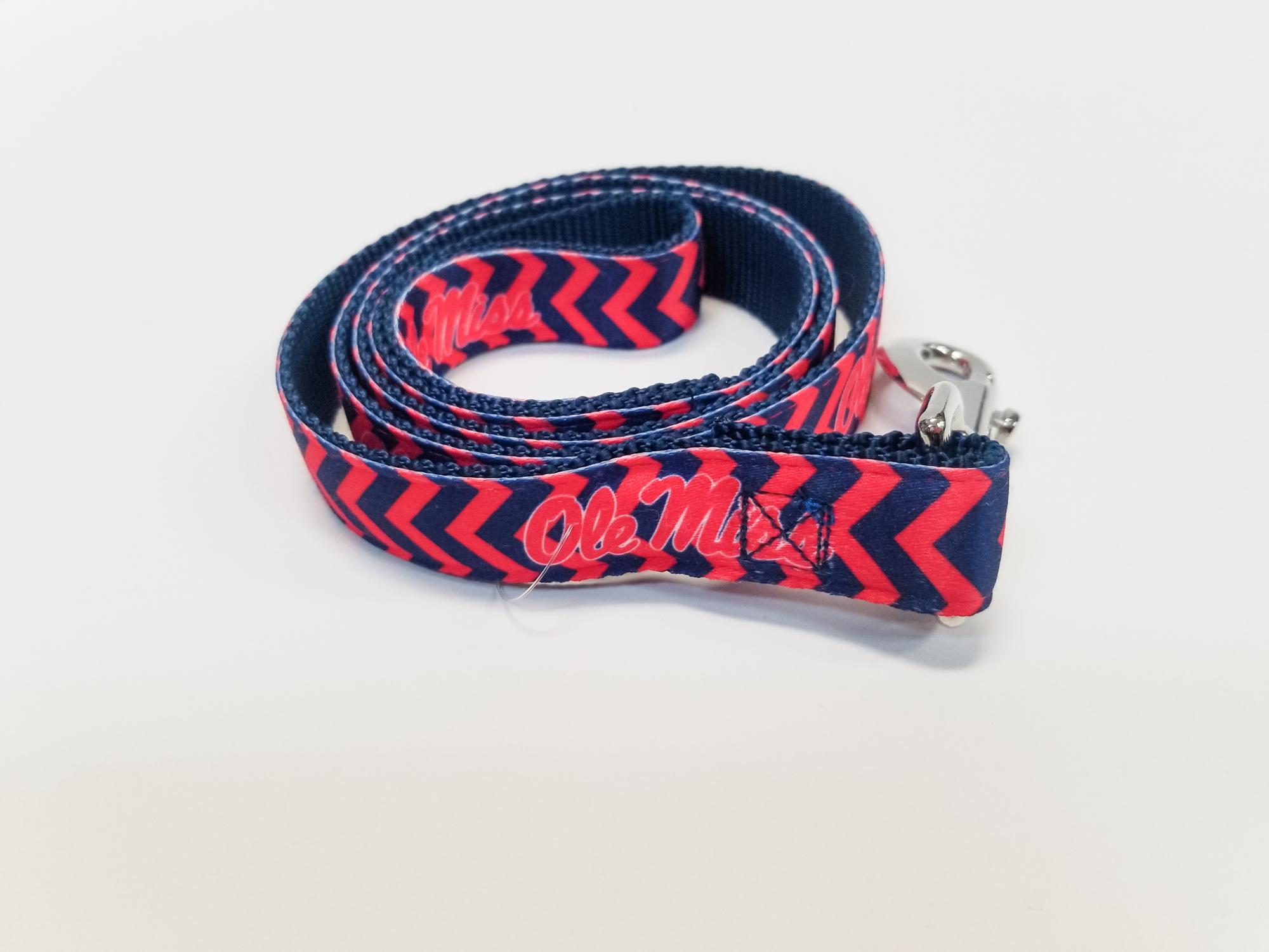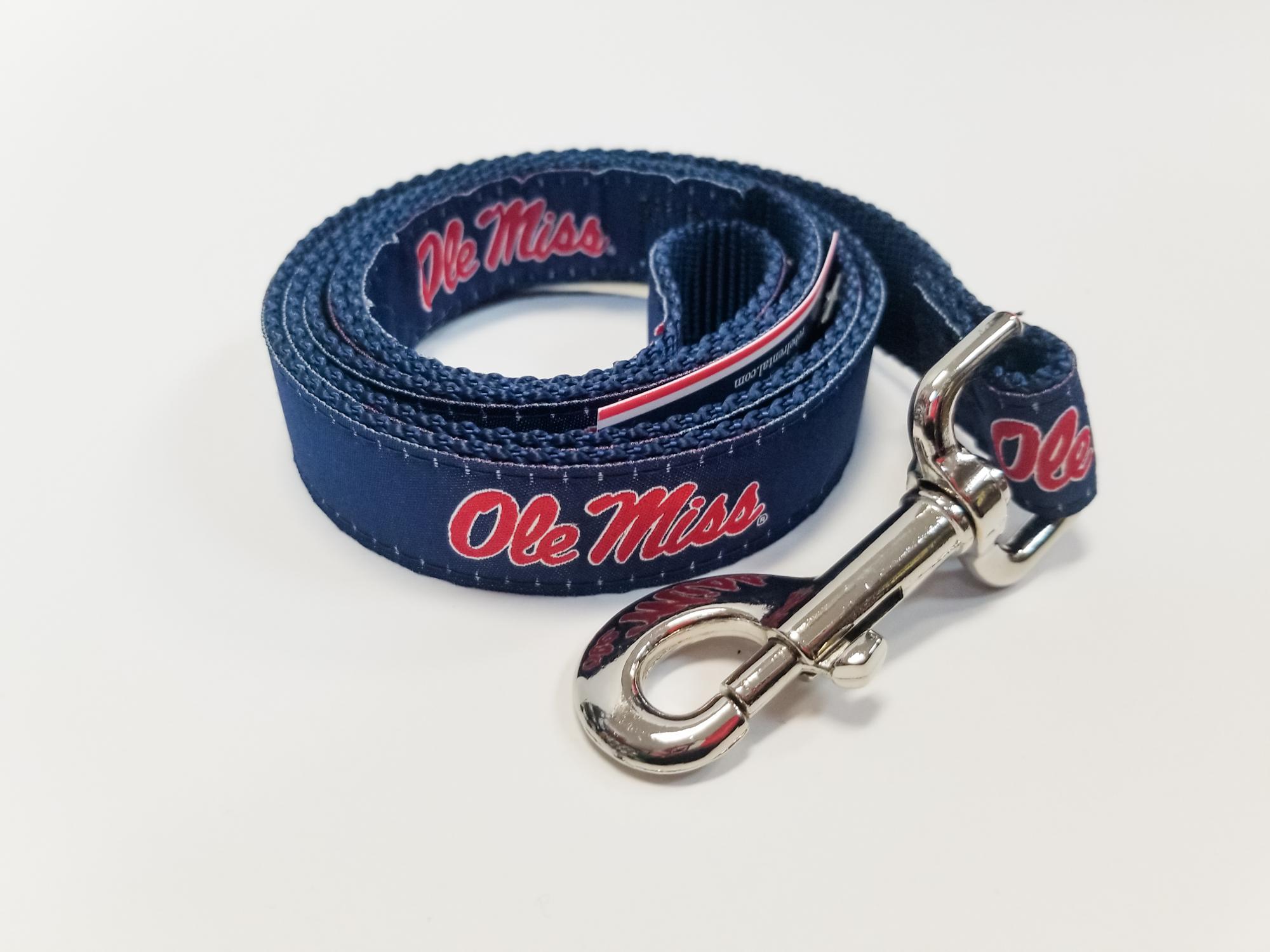 This 4' leash is constructed of nylon webbing covered with 1" wide Ole Miss ribbon. It is strong and durable and will stand up to whatever your four legged Rebel can throw your way.