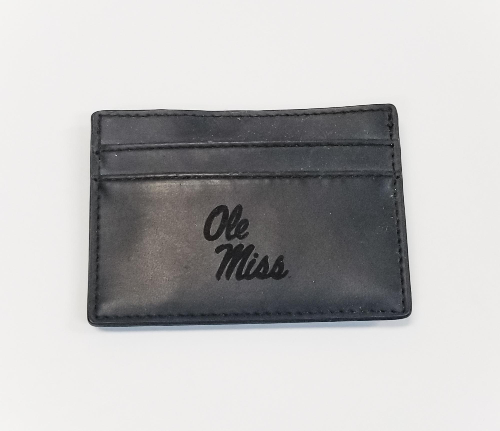 Black leather money clip embossed with Ole Miss script on one side. Two credit card pockets. Money clip on the back.
