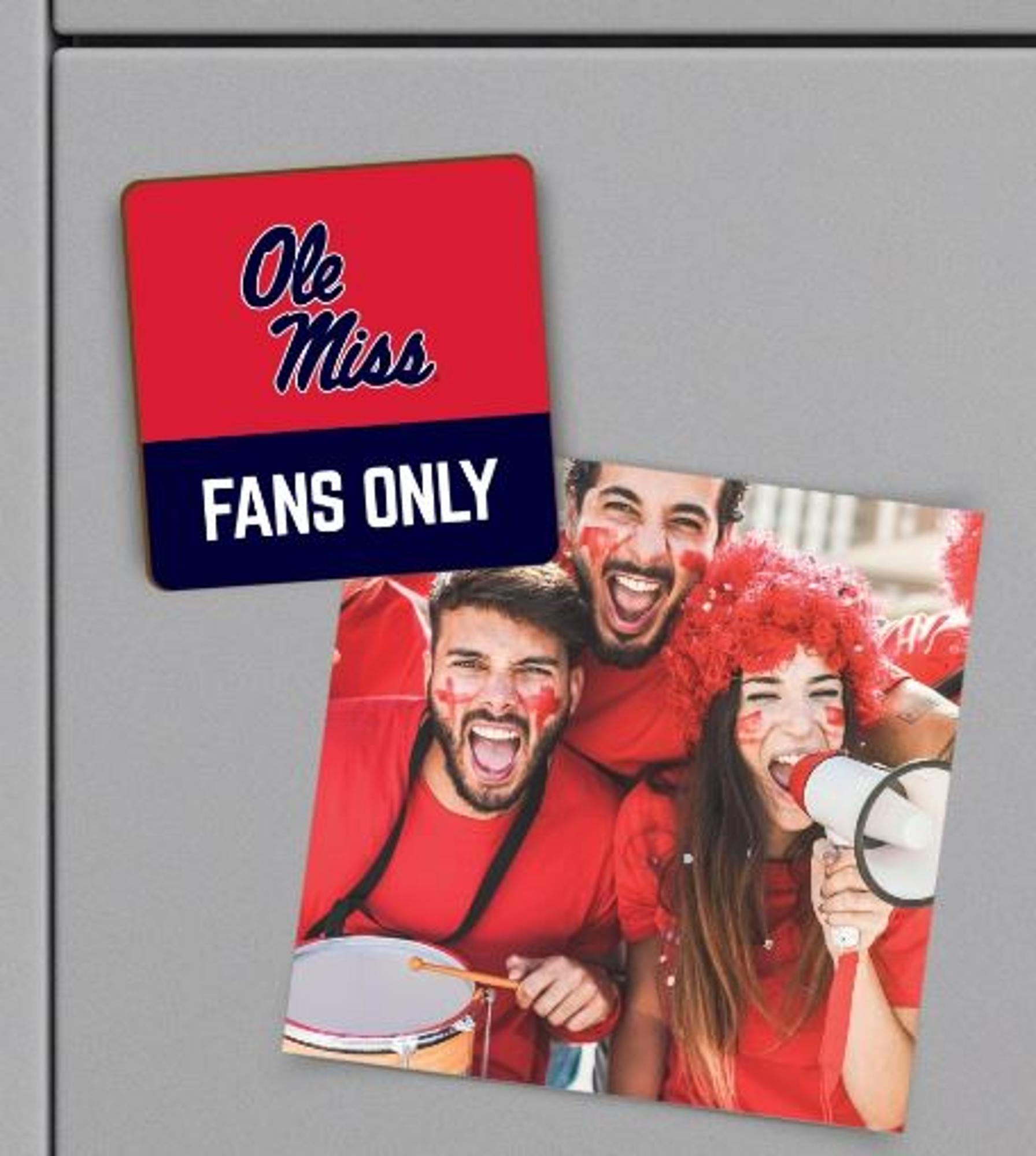 2.75'' W x 2.75'' H. This magnet is designed to stick to any metal surface - refrigerators, desks, and toolboxes. And it's strong enough to hold up team photos and Ole Miss Rebels season schedules. Features a soft magnetic backing to keep surfaces free of scuffs and scratches.