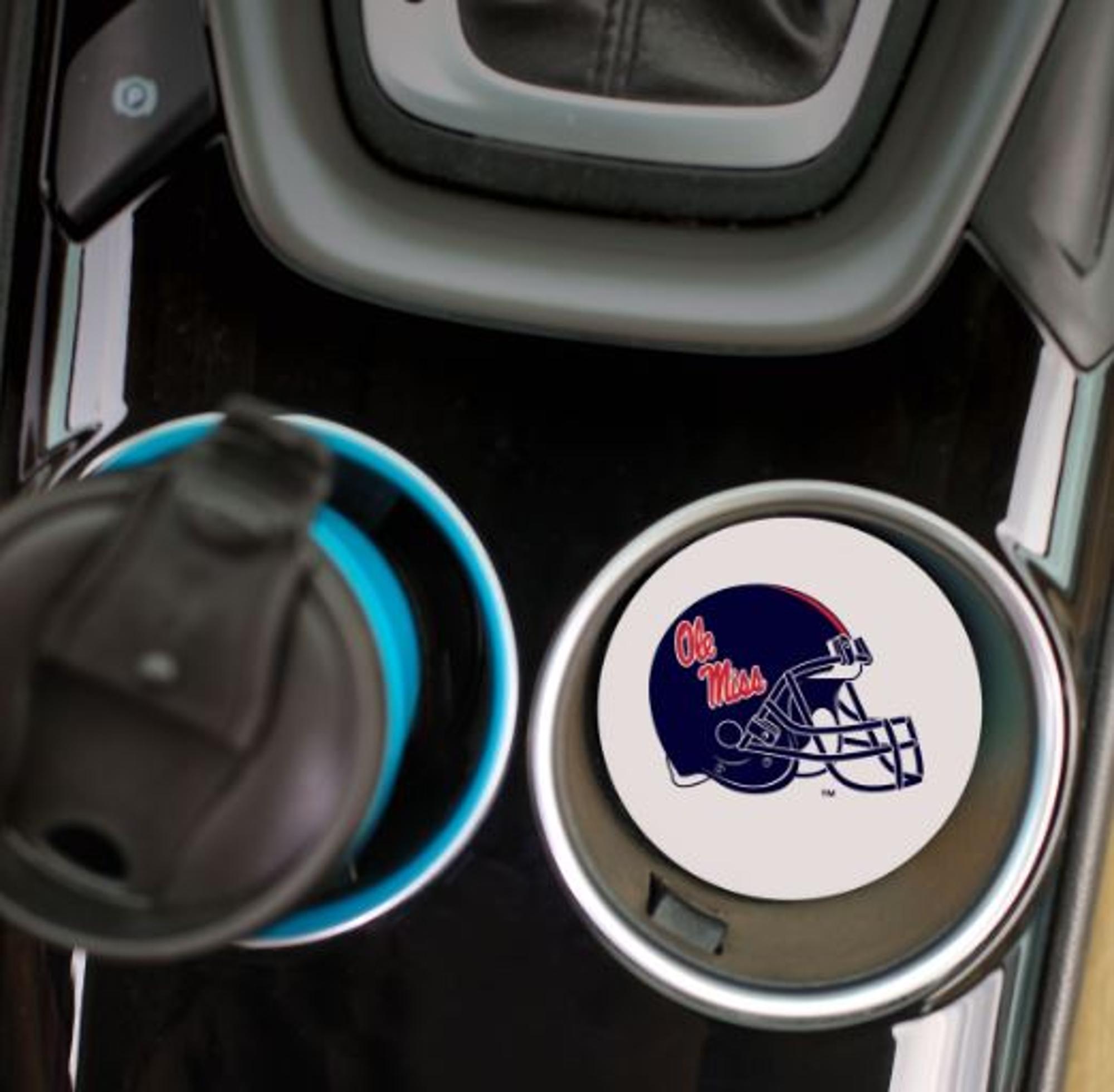 Utilize this Ole Miss Football Helmet car coaster to support your Ole Miss Rebels all season long. Functional and filled with school spirit, this car coaster keeps your vehicle cup holder and console dry. Each piece includes a convenient slanted edge, allowing for easy removal for cleaning.