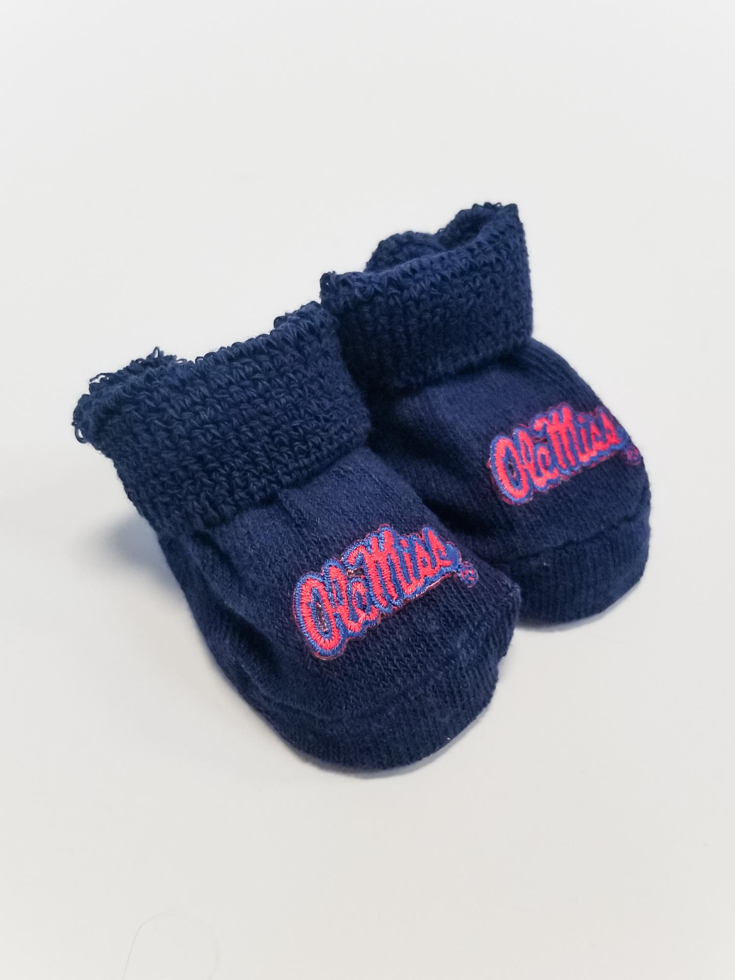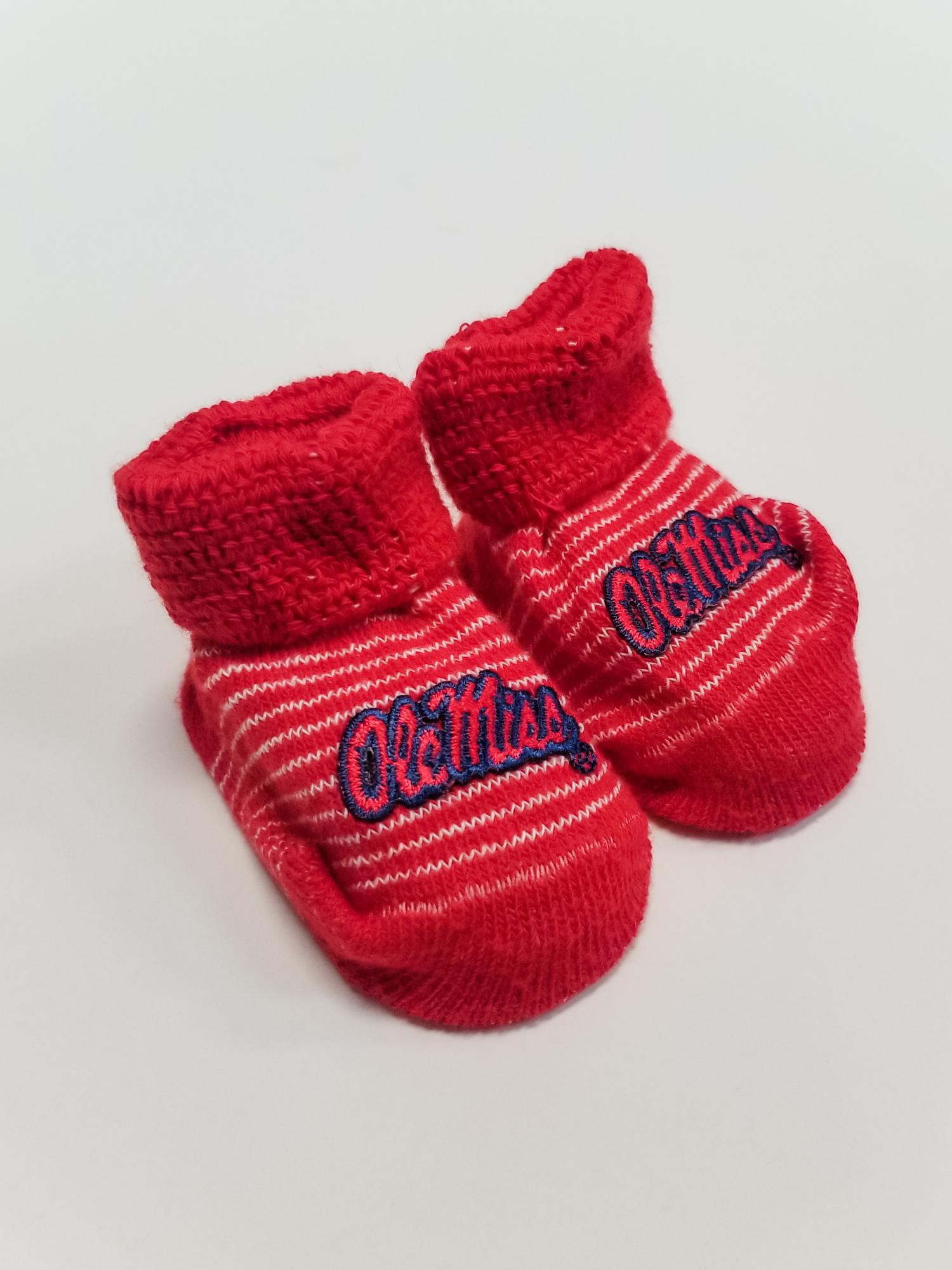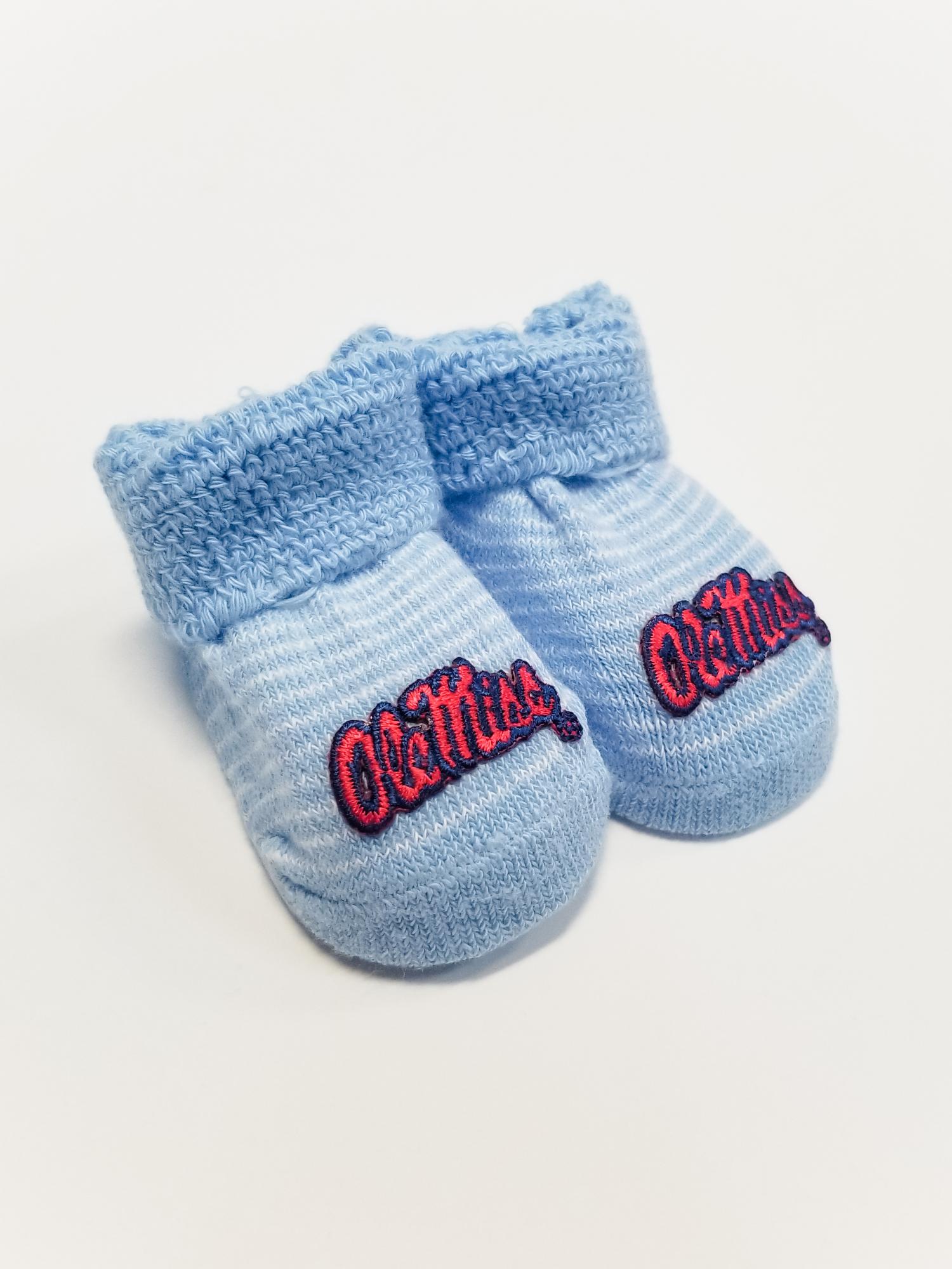 85% cotton, 13% nylon, 2% spandex. Solids--$7.99. Stripes and polka dots--$9.49. These adorable Ole Miss baby booties come in a clear acrylic gift box. Perfect to coordinate with other Ole Miss layette items.
