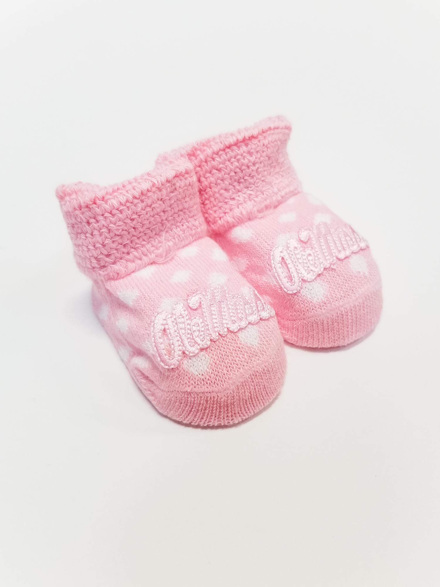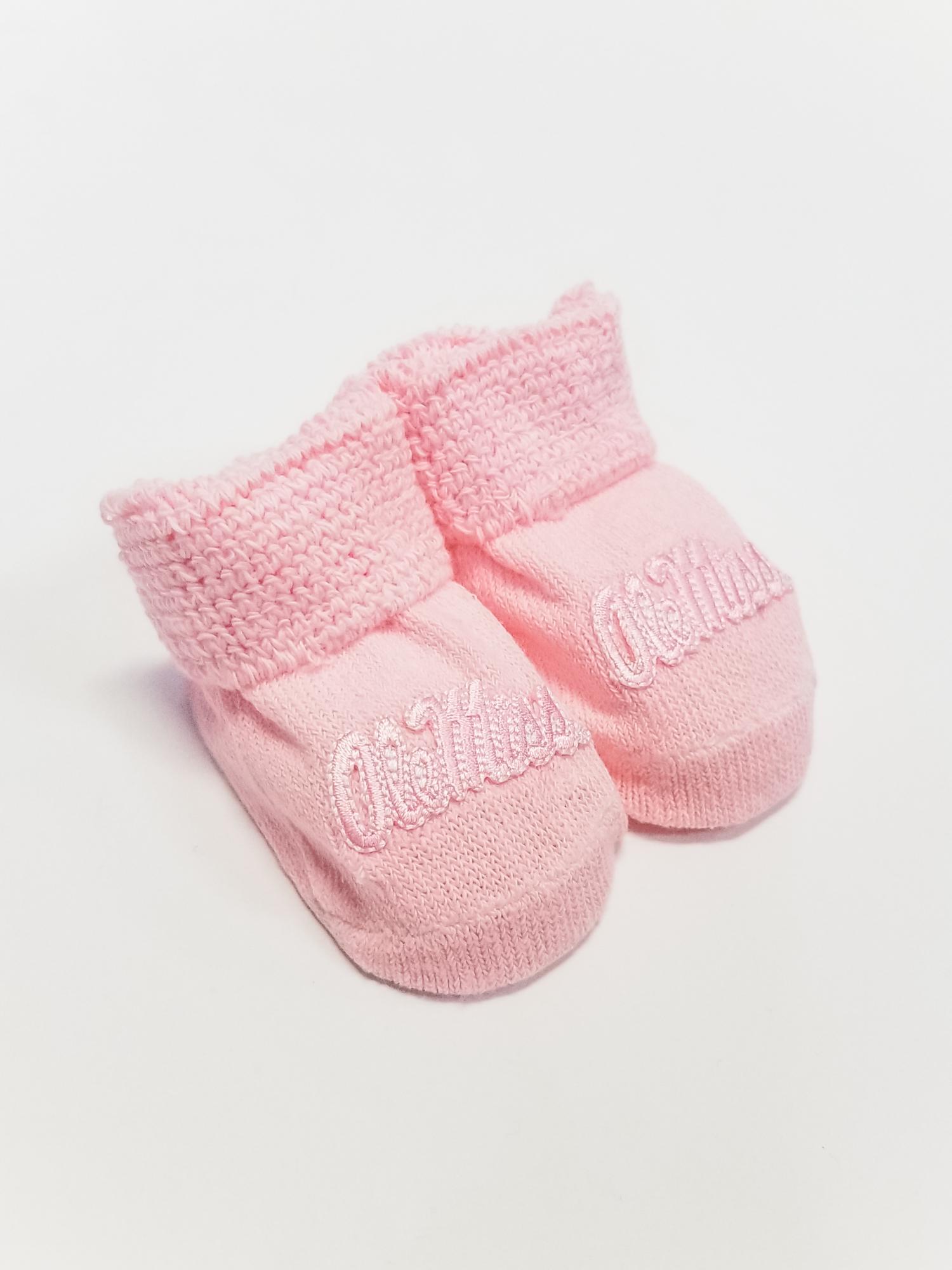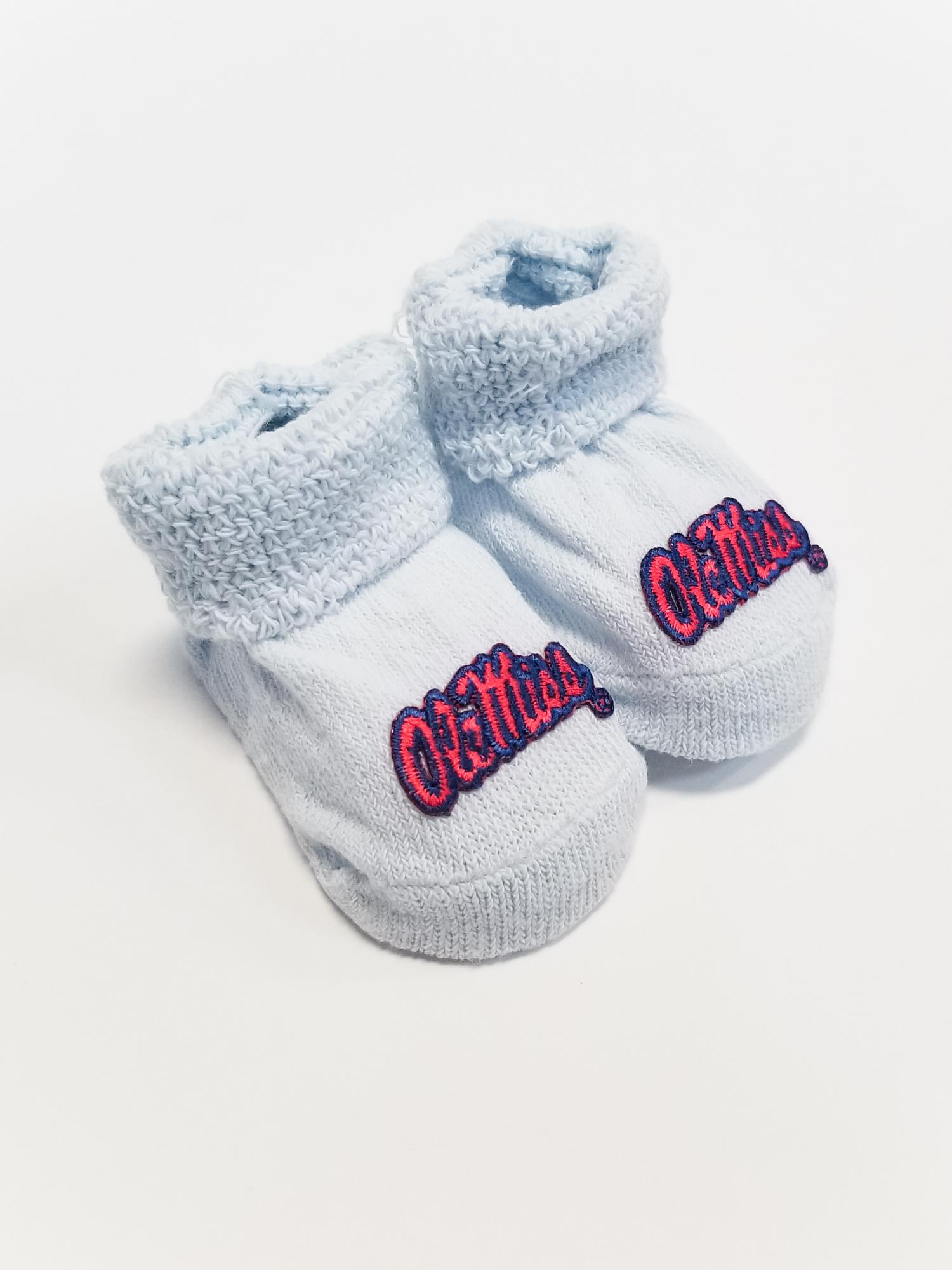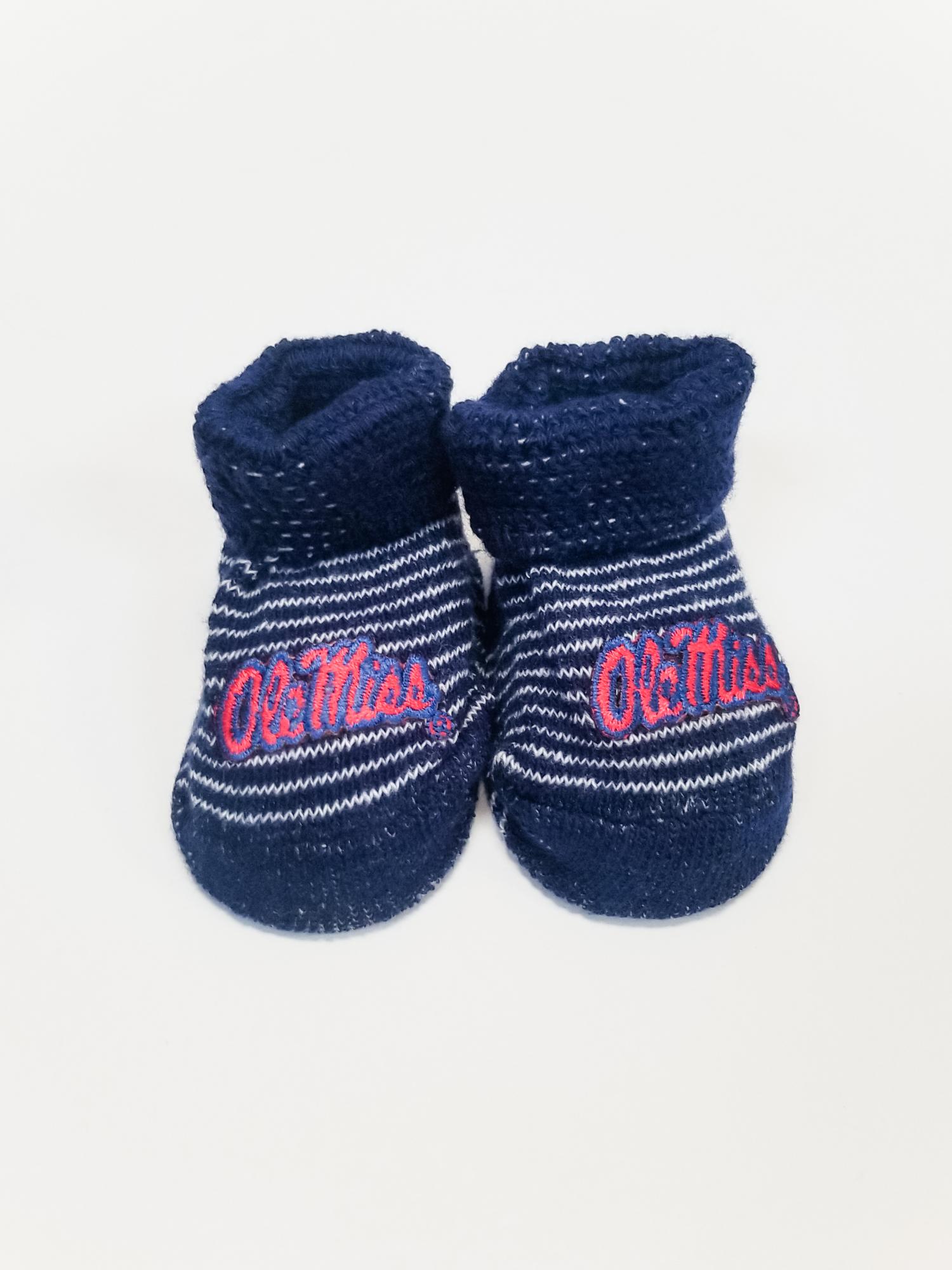 85% cotton, 13% nylon, 2% spandex. Solids--$7.99. Stripes and polka dots--$9.49. These adorable Ole Miss baby booties come in a clear acrylic gift box. Perfect to coordinate with other Ole Miss layette items.