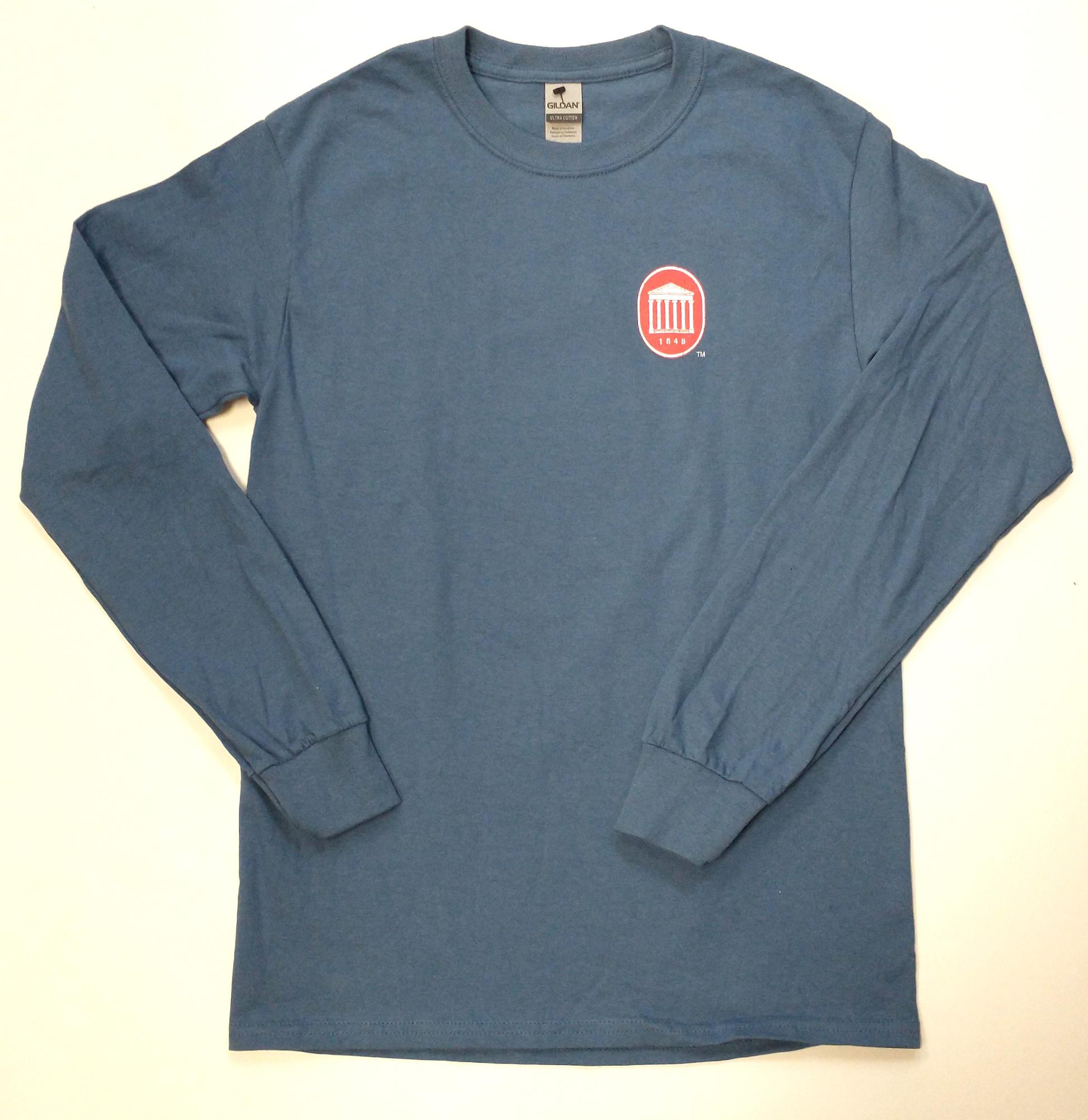 100% cotton long sleeve Ultra Cotton tee by Gildan. Distressed Lyceum Crest on the front left chest. Back design features the outline of the State of Mississippi with a Vault UM inside it. Ole Miss is above and Home of the Rebels with Est 1848 is below. Great looking Ole Miss shirt for cooler days.