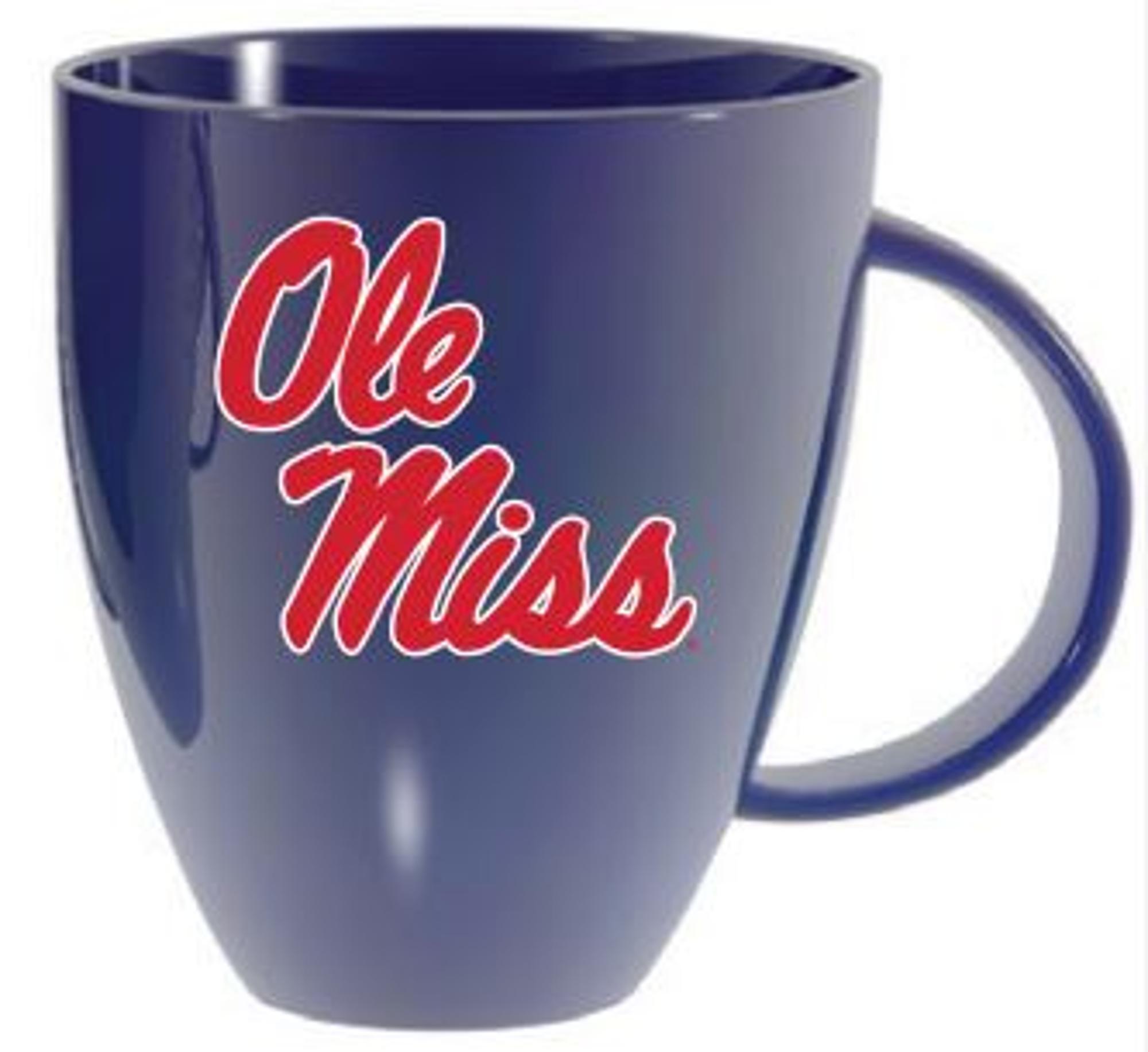 Glossy, lustrous glaze. 18 oz capacity with elegant oversized handle. Dishwasher and microwave safe. One-sided art. Start your morning right with this bright and shiny Ole Miss mug.