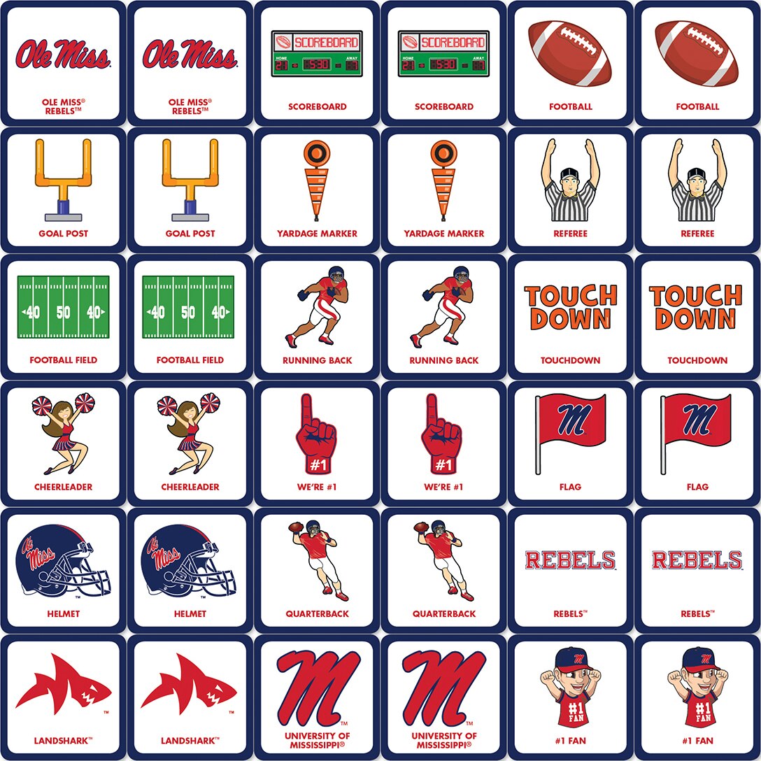 Classic matching game for ages 3 and up. Includes 18 sets of cards. The perfect way to teach your little one the basics of being an Ole Miss Rebels fan!
