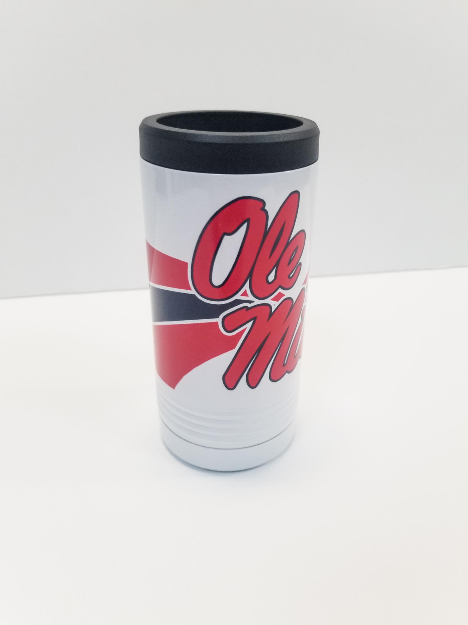 This Ole Miss metal slim can koolie features double-wall, vacuum insulation. It is heat and cold resistant and holds a 12 oz taller slim can. Simply screw off the rubber top and place the beverage inside. Then replace the rubber top for a secure fit. Hand wash only. The wavey wraparound design has retro flair and will show you're an Ole Miss Rebels fan with an old-school soul.