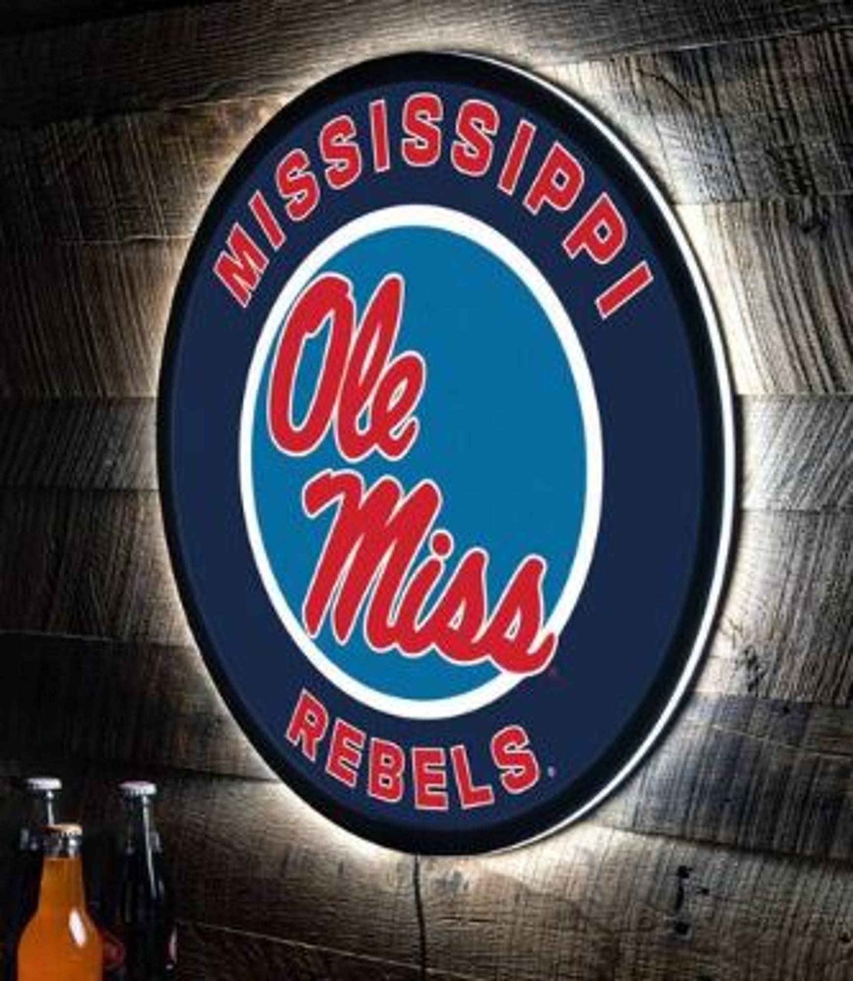 This large round acrylic sign measures 23" in diameter and features Ole Miss script surrounded by Mississippi Rebels. Features a flat surface, 50,000 hour LED bulbs, and full 360 degree edge lighting. On/off switch on cord. For indoor use only. This quality sign will be the highlight of any Ole Miss Rebels man cave!