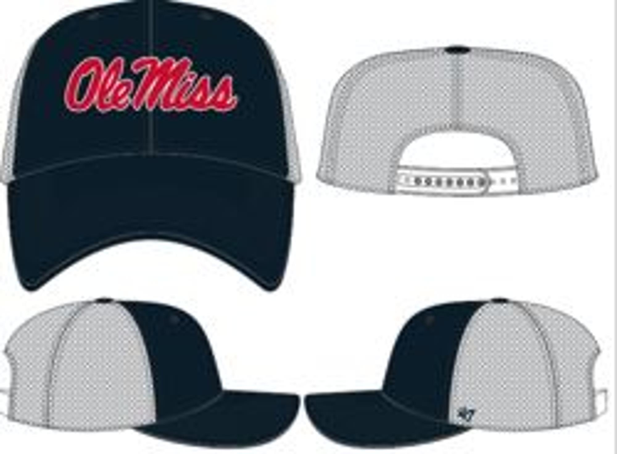 Classic trucker with structured crown and snapback closure. Crisp white mesh with red and white Ole Miss script embroidery on navy. Navy underbill. You'll look sharp in this Ole Miss hat.