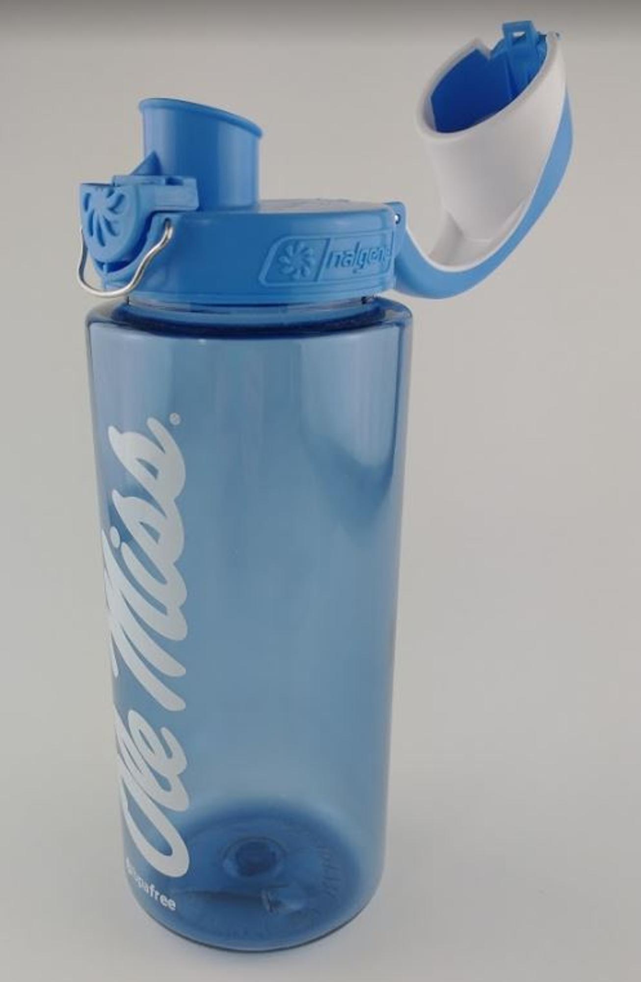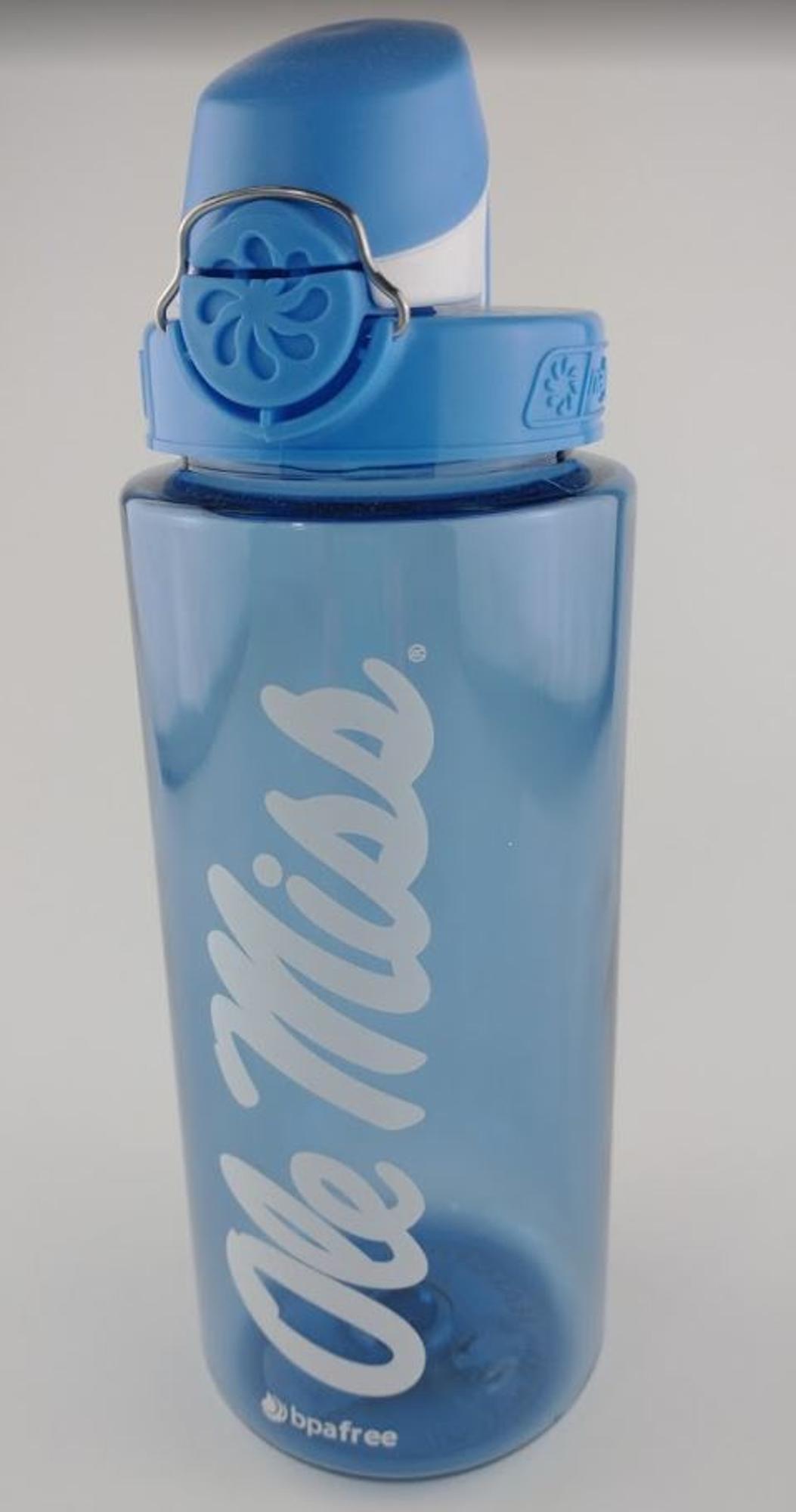 Eighteen-ounce bottle with a unique flip top that fully covers/uncovers the drinking spout. Metal loop to lock. Great for kids and adults. This water bottle will show your team spirit for the Ole Miss Rebels! Available in red and blue.