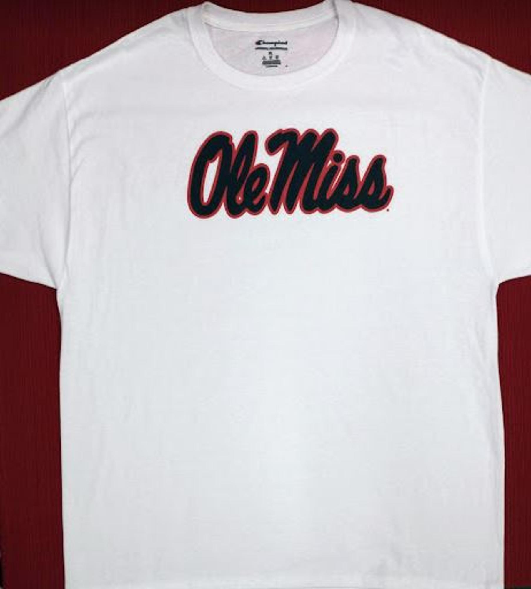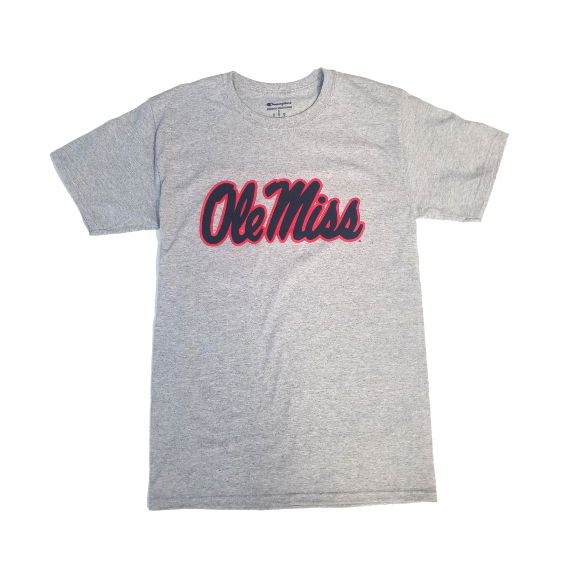Unisex sizing. A twist on our usual Oxford Grey Script Tees with navy Ole Miss script instead of red.