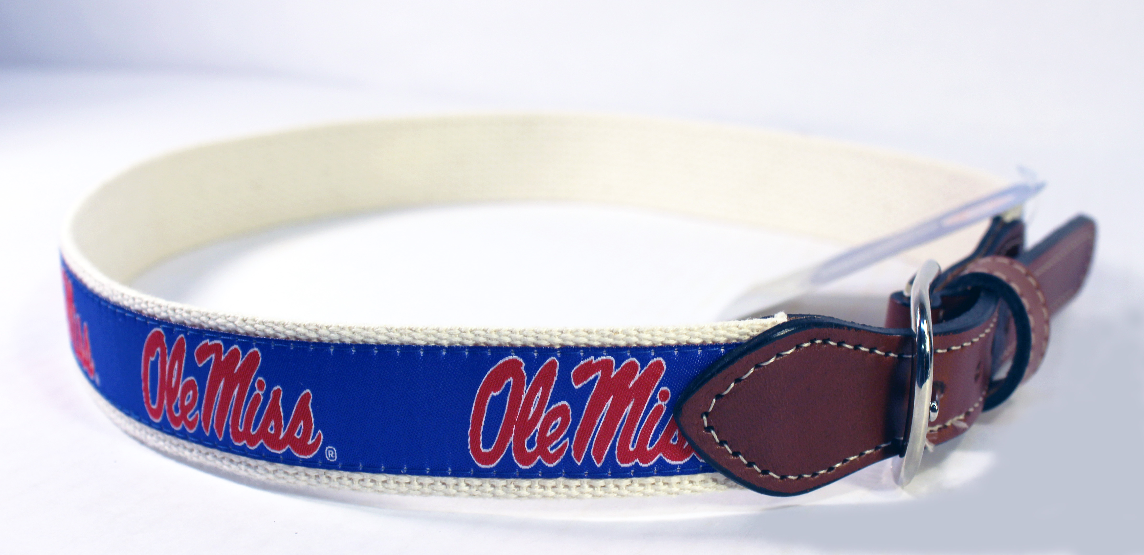 1.25" wide canvas belt with Ole Miss ribbon applique and leather buckle. This comfortable belt will keep you looking polished and show your love for the Rebels. Available in navy ribbon on navy canvas OR blue ribbon on natural canvas.