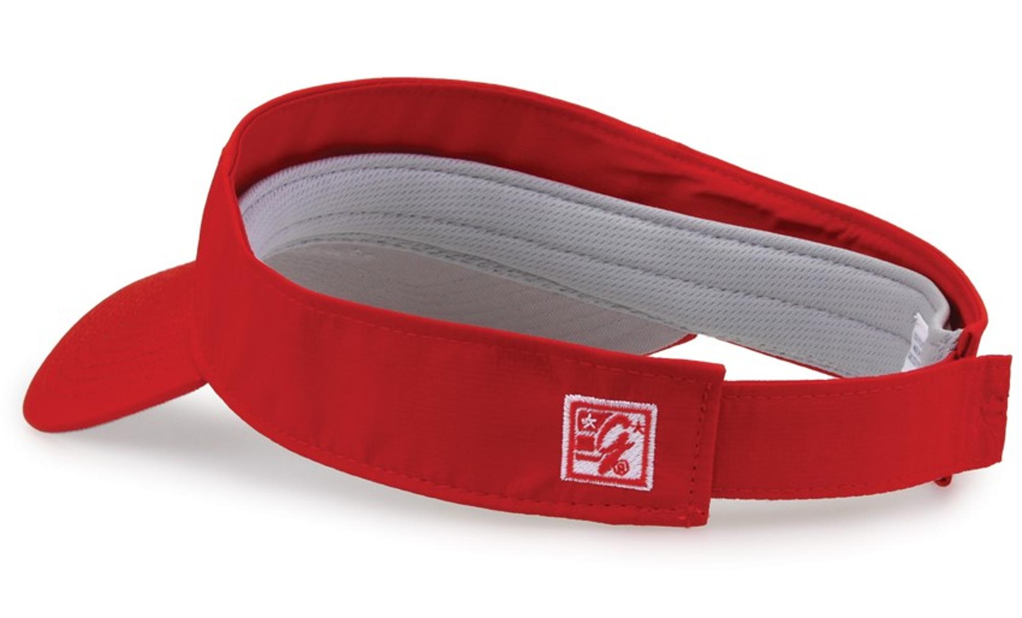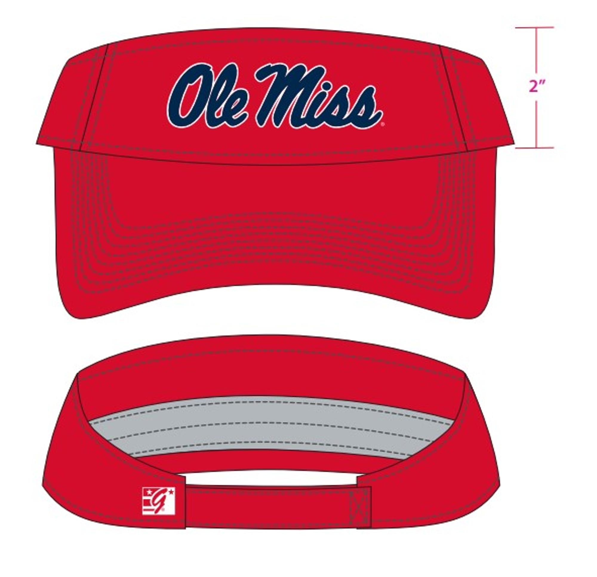 Ultralight visor with performance sweatband and Velcro backstrap. Features flat Ole Miss script embroidery in navy with a white outline.