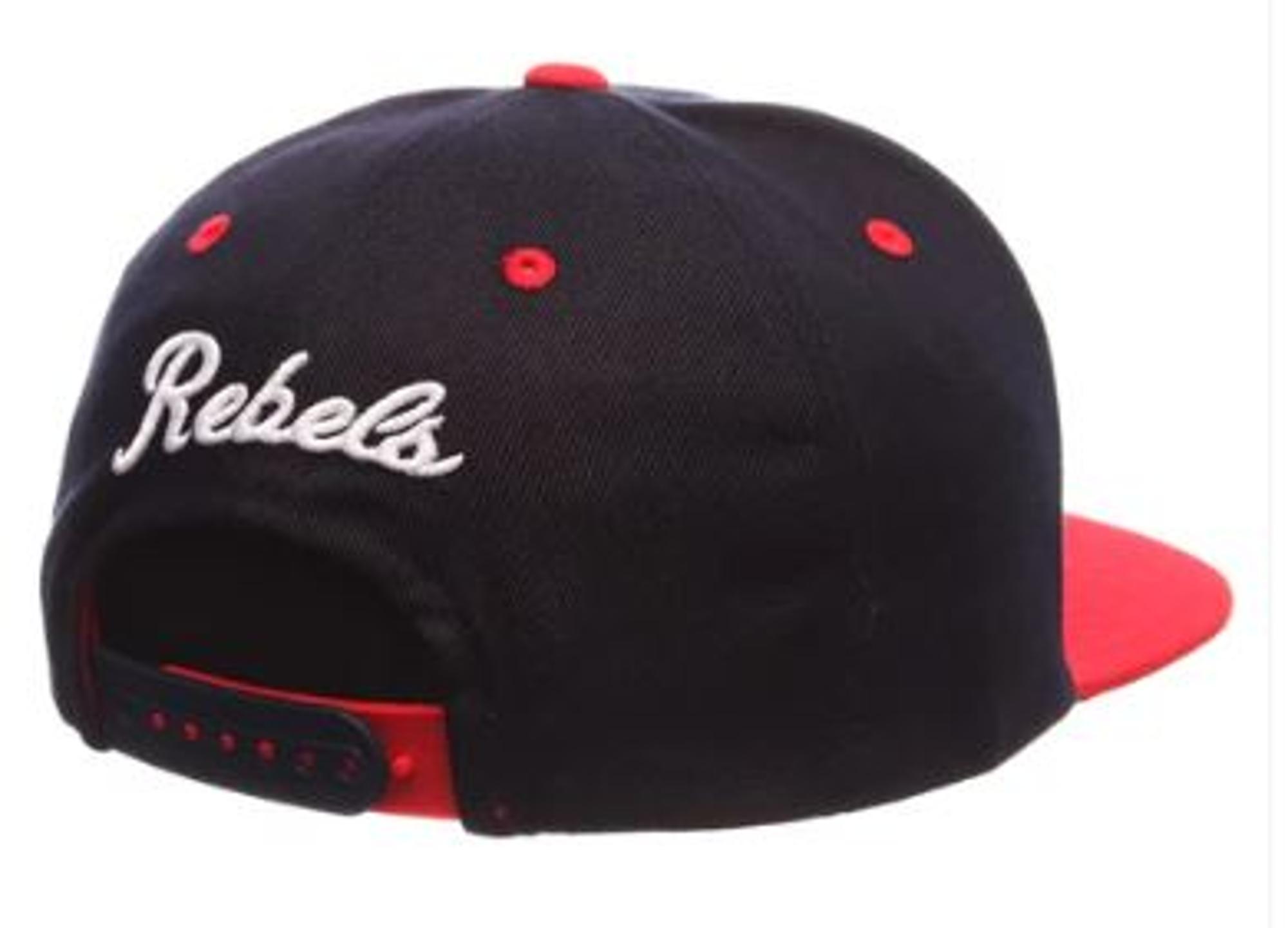 The Z11 is the classic snapback, distinguished by its 6 paneled shape, flat bill, 2-colored snapback closure, and contrasting eyelets. This hat features a red bill, Ole Miss script on the front, and "Rebels" in stylized white script on the back.