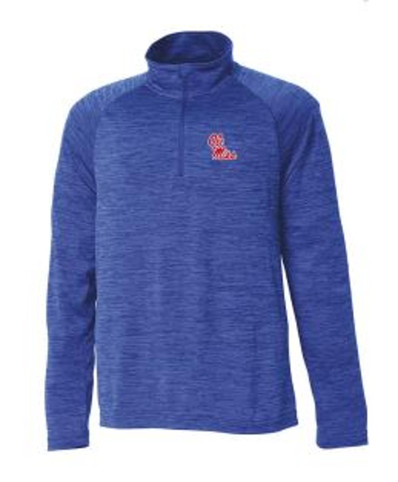 100% polyester yarn-dyed jersey knit with a unique space dye effect. TopShield™ Technology with Moisture Wicking and Anti-Microbial fabric properties. Ultraviolet Protection Factor of 20+ (blocking up to 95% of UV radiation). Raglan sleeve styling for increased range of motion. Double-needle cover stitch on raglan seams for added durability. Quarter zip pullover with wind flap to help prevent chafing and for added comfort. Great pullover for working out or for an Ole Miss game day.