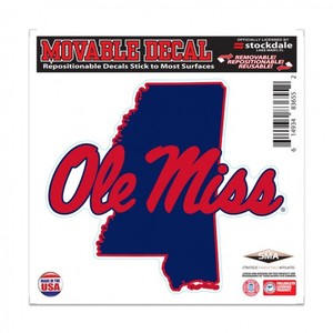 This large die-cut decal is printed on a 6x6 background and features red Ole Miss script across the navy shape of the State of Mississippi. It is movable and repositionable and leaves no messy residue. Perfect for a laptop, file cabinet, or other smooth surface. Not suitable for outdoor applications.