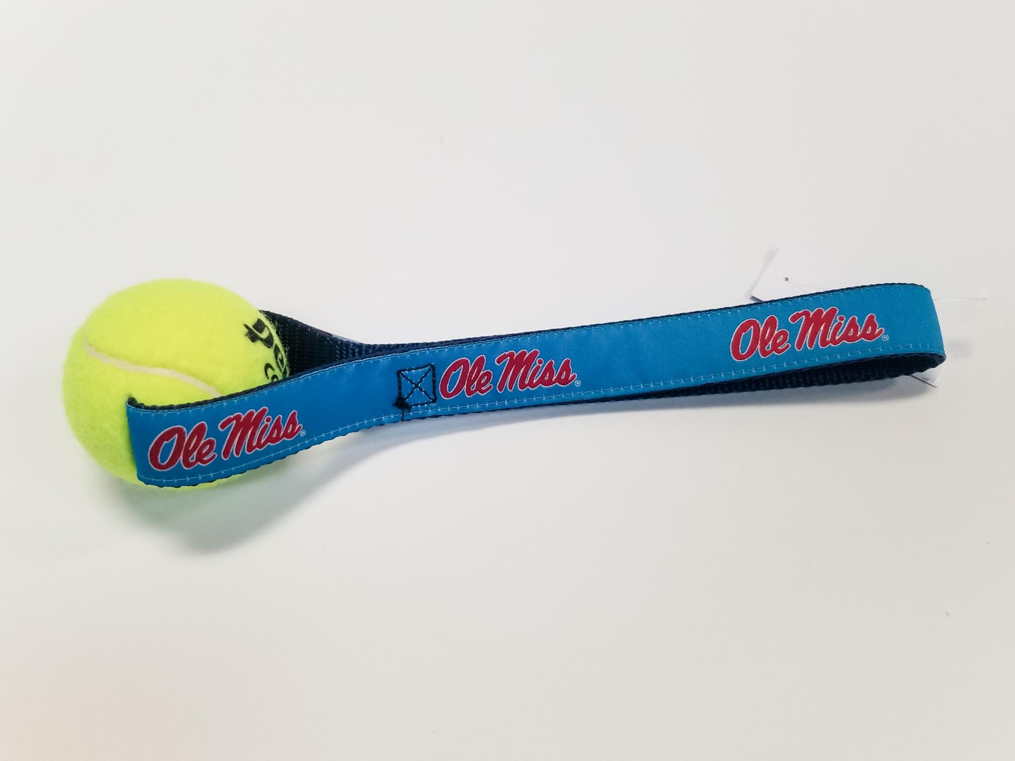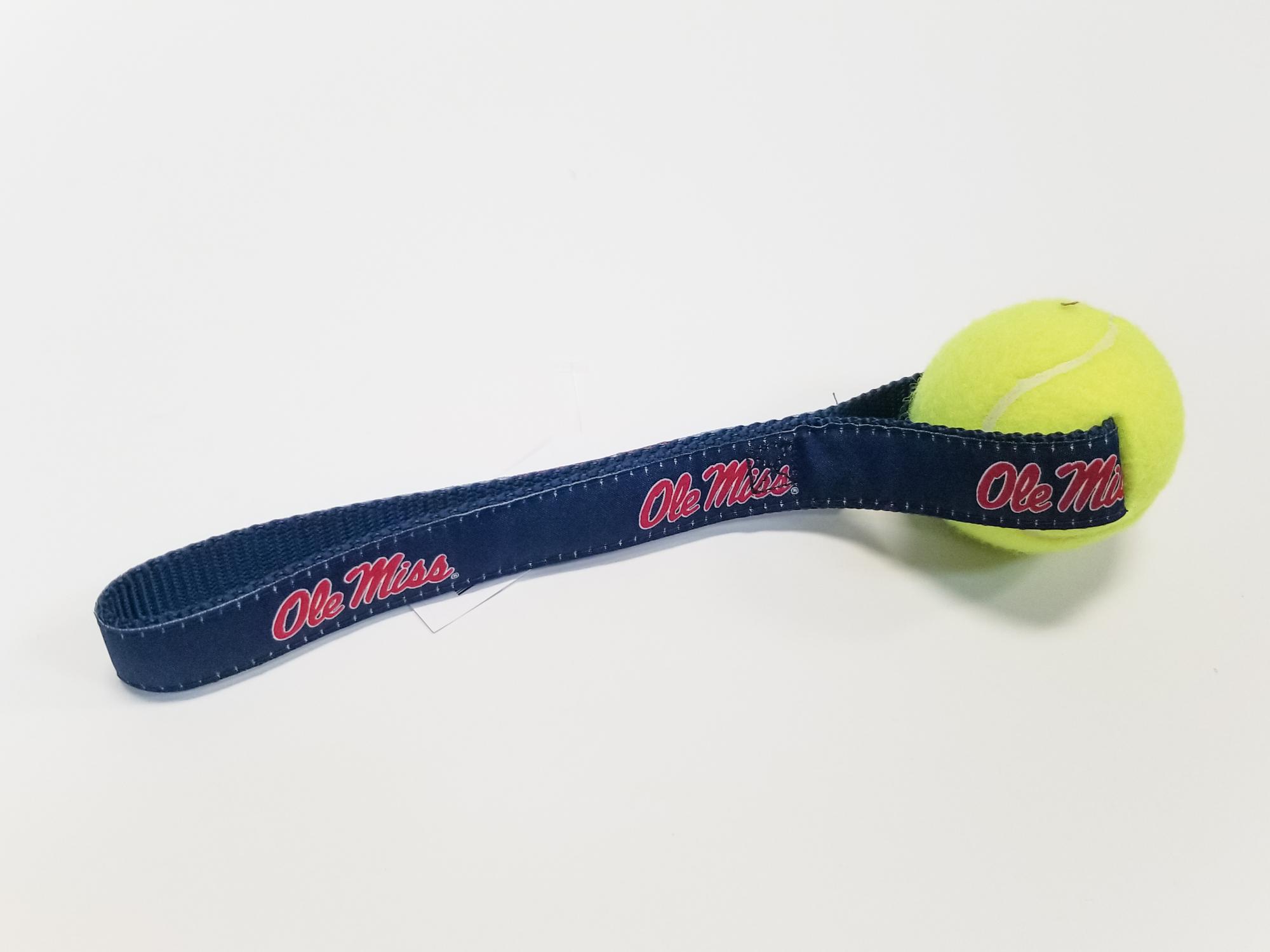 Let your dog share in the Ole Miss spirit! This toy features a tennis ball attached to a web loop covered with Ole Miss script ribbon. Dog approved. Hotty Toddy!
