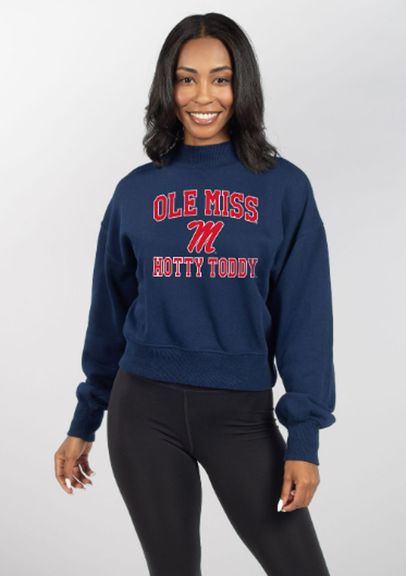 60% cotton, 40% polyester. Stand out from the crowd with this on-trend mock neck cropped sweatshirt. Drop shoulders, ribbed waistline and balloon sleeves. Made from an oh-so-soft fleece! The two-color art features Ole Miss and Hotty Toddy surrounding a script M. Perfect gift for an Ole Miss Rebels fan!