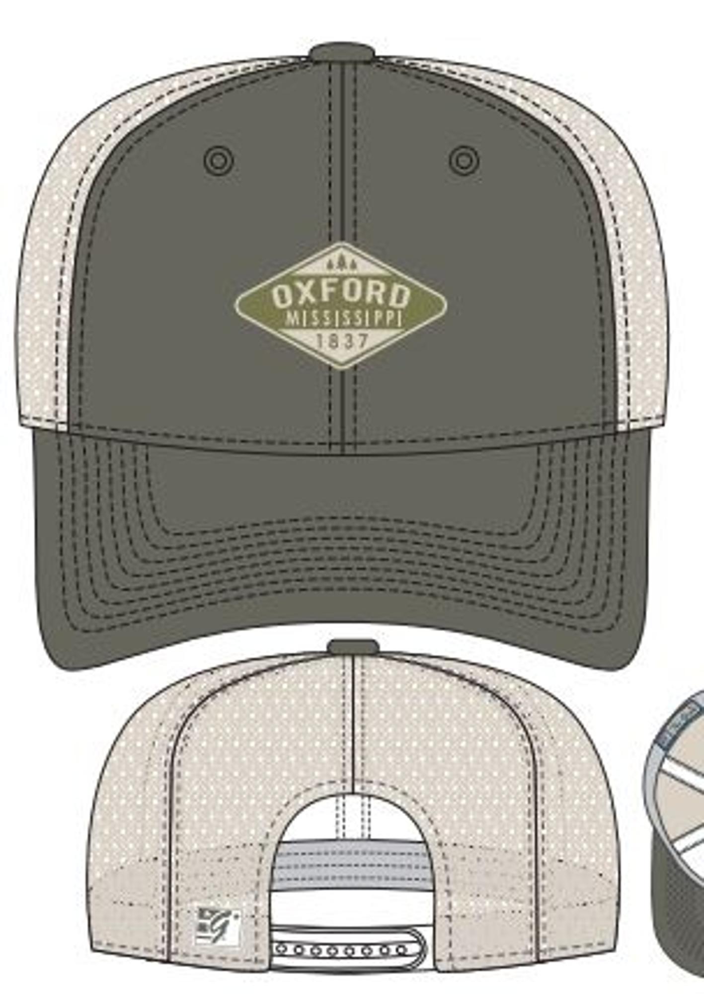 Light olive cotton twill and stone trucker mesh with slightly curved bill. Mid Pro crown. Structured shape. Snapback closure. Twill patch with olive and stone embroidery includes Oxford, Mississippi 1837. Selected as ESPN's Best College Town in the fall of 2021, Oxford is the place to represent!