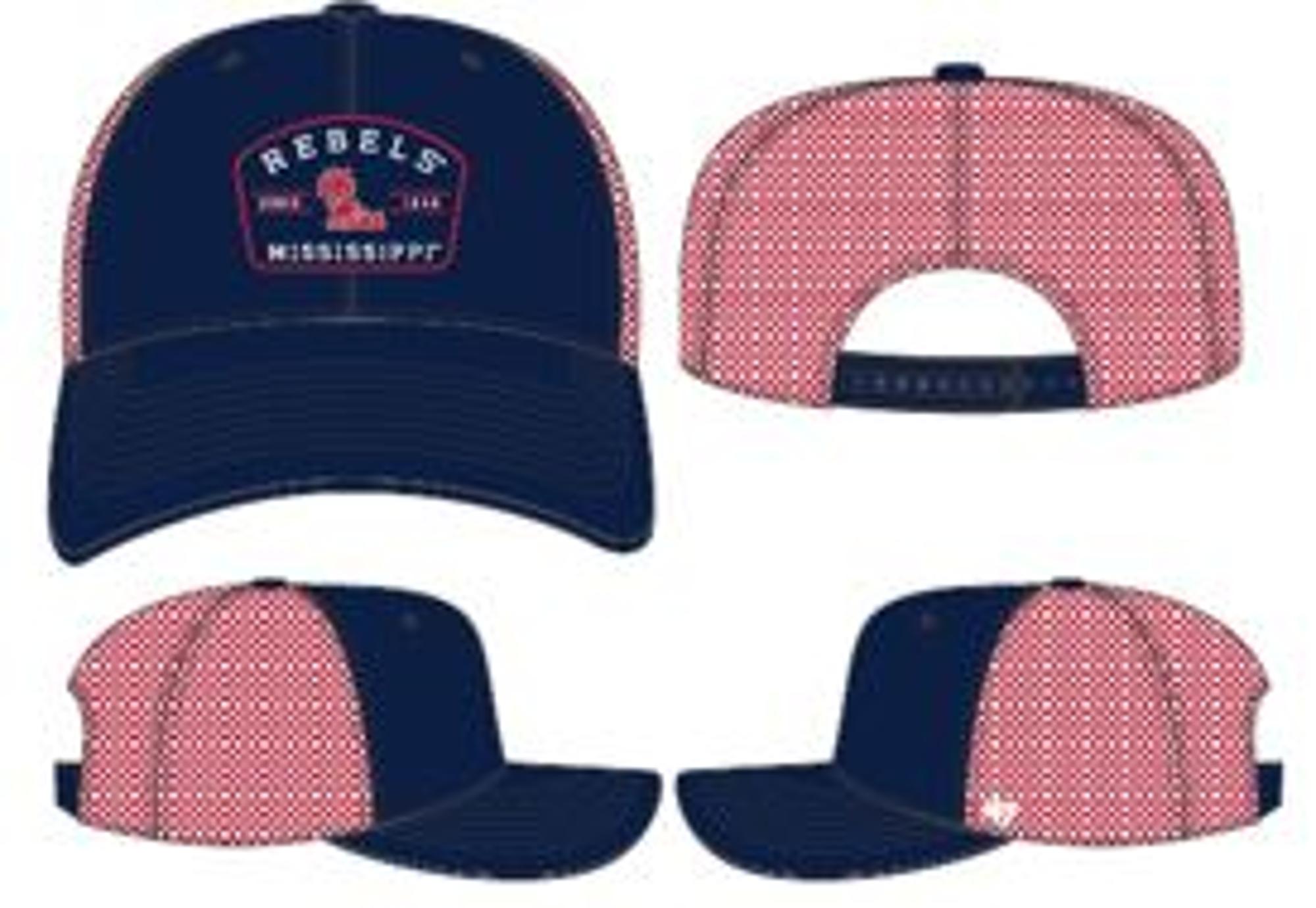 Structured crown with snapback closure. Navy body with red mesh. Printed patch with red threaded outline. Slightly curved visor. Patch reads, "Rebels, Ole Miss Since 1848, Ole Miss." This good-looking hat offers classic Ole Miss colors and style.