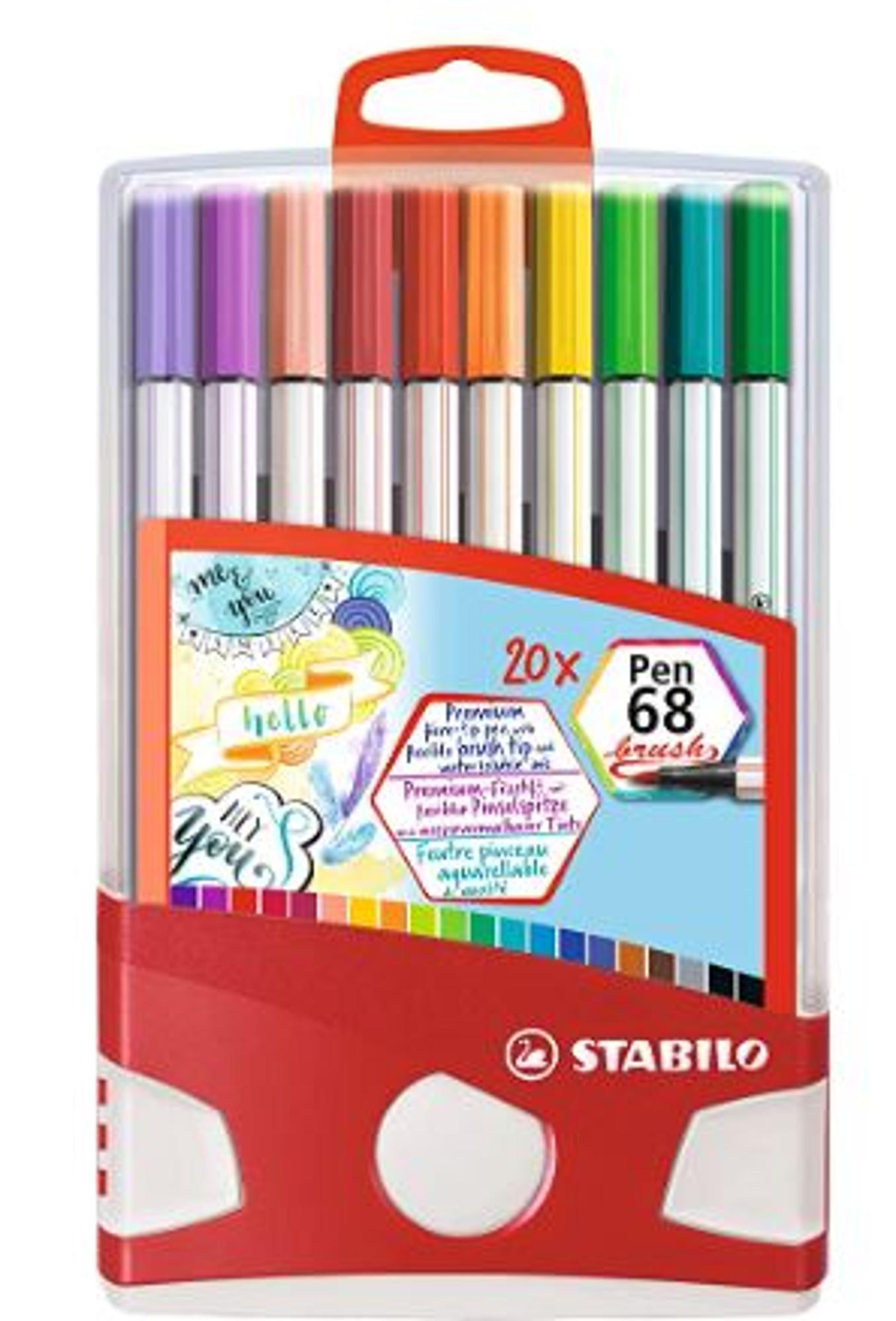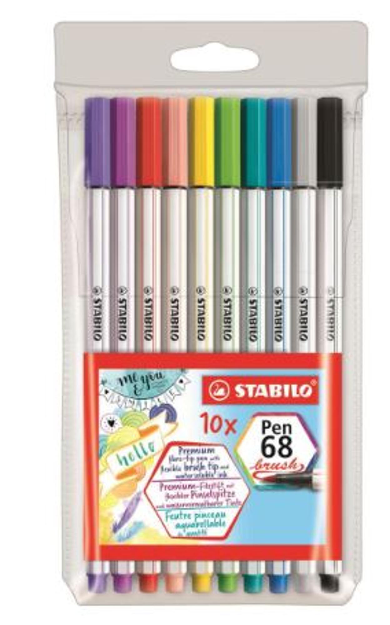 Pen 68 Brush Markers provide thick and thin lines in brilliant colors. Ideal for color progression, blending, watercolor effects, and brush lettering for beginners or advanced artists. The markers have great coverage and feature up to 24 hours of dry-out protection without a cap. Sets include a variety of colors. The 10-marker set comes in a vinyl storage envelope. The 20-marker Color Parade set comes in a stand-up plastic holder.
