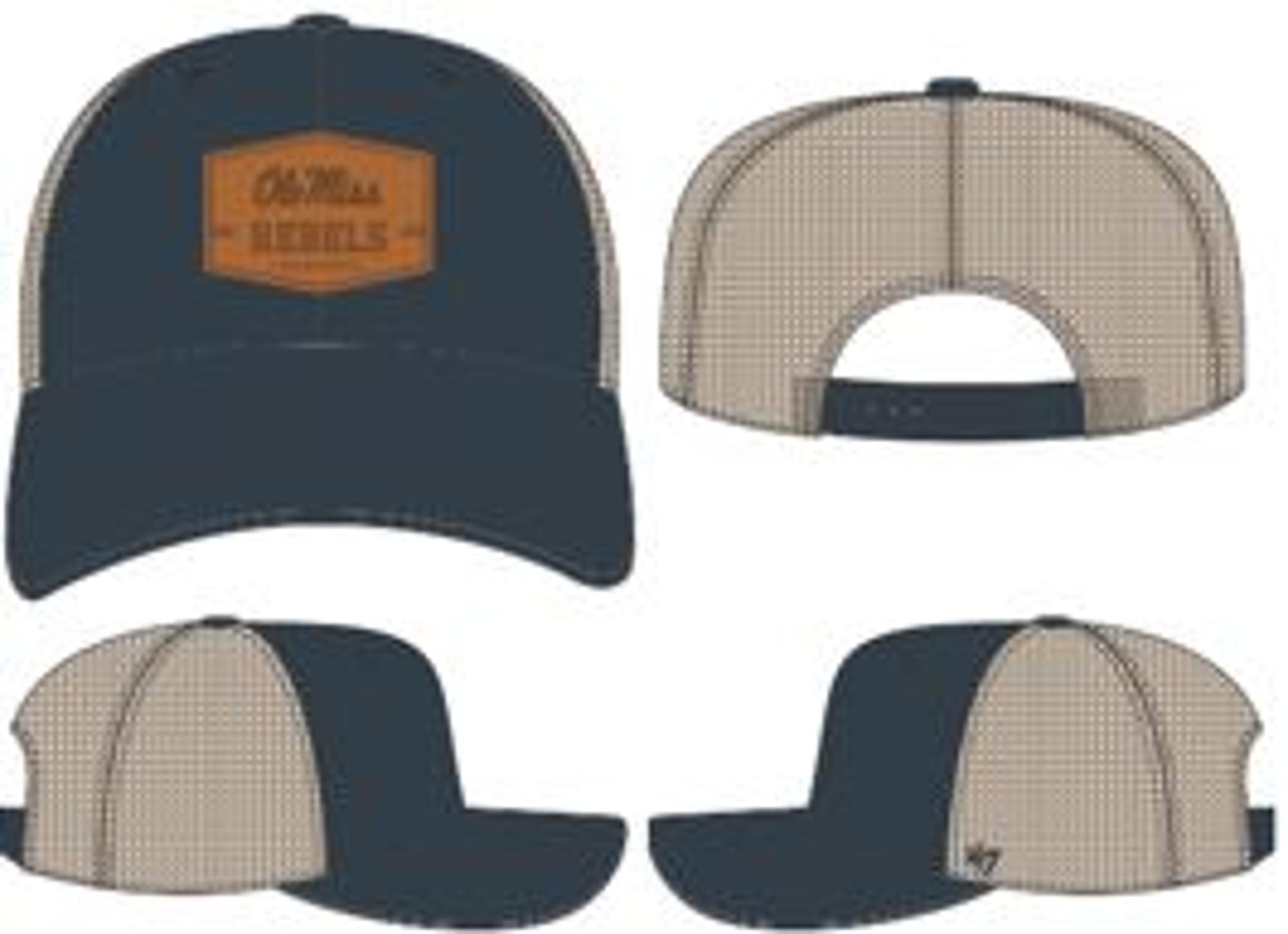 Structured crown with snapback closure. Vintage navy body with "stained" mesh. Faux rawhide patch reads, "Ole Miss Rebels, U of M." Slightly curved bill. Great hat for fall on the Ole Miss campus!