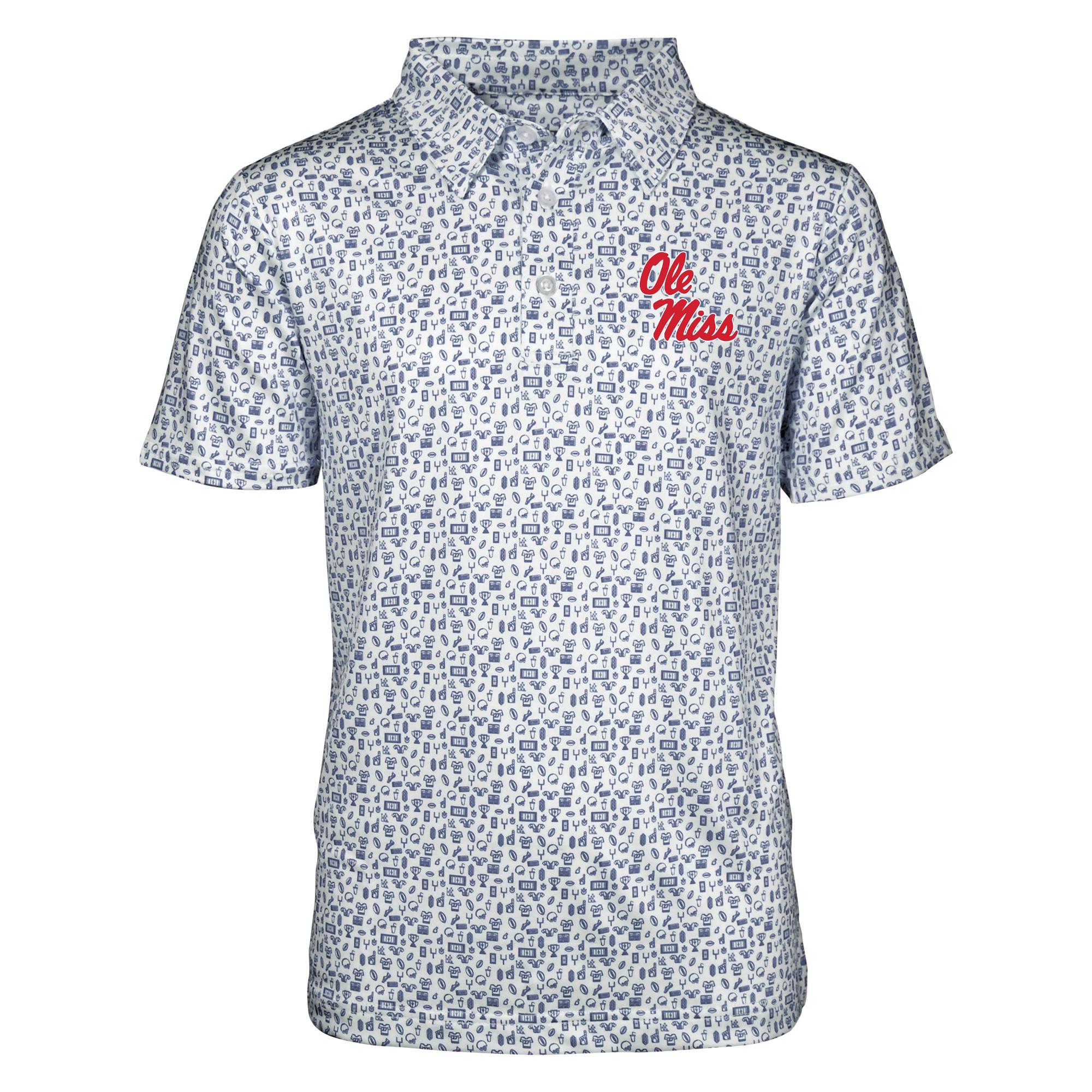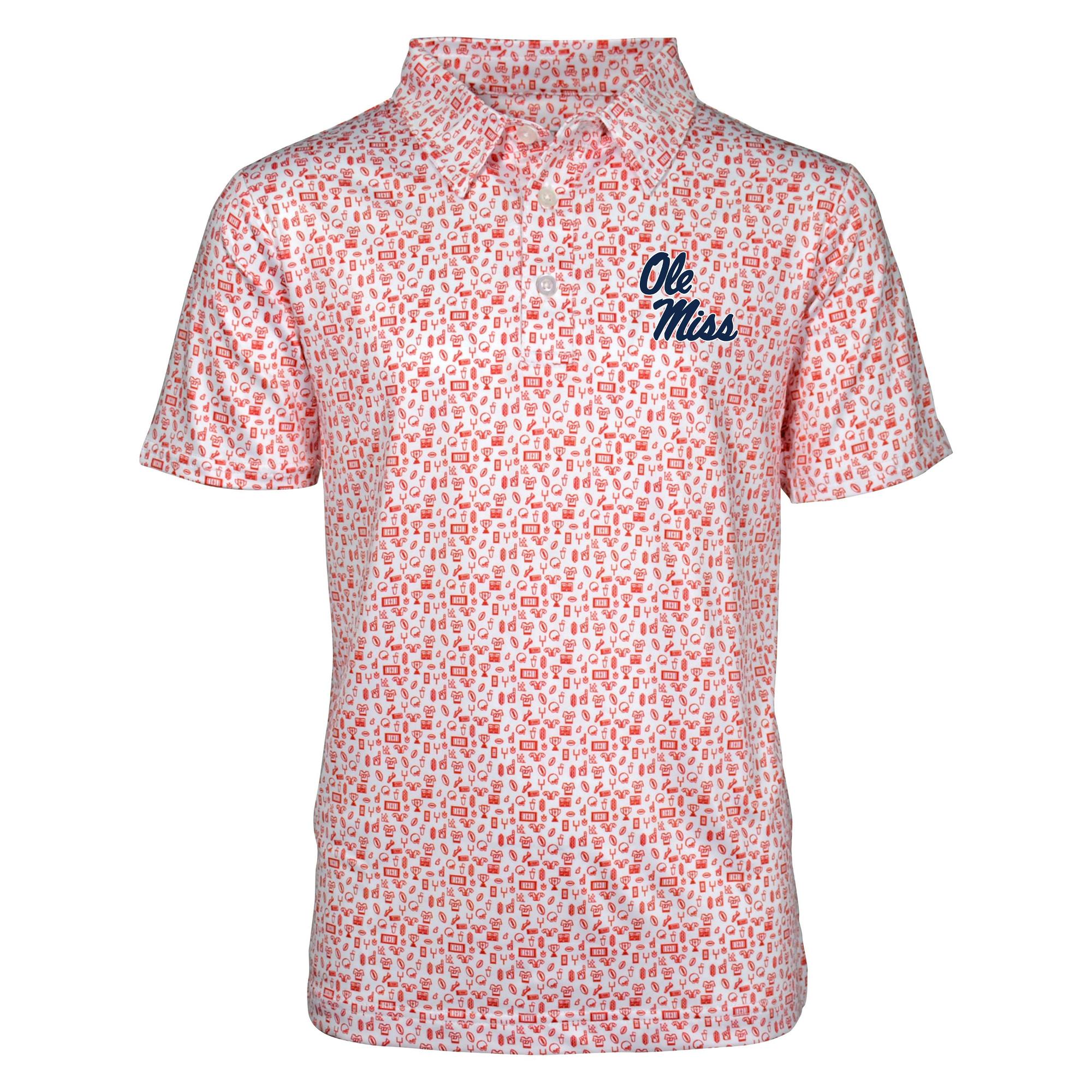95% polyester, 5% spandex. Overall football theme print includes football gear, food, and spirit items, etc. Ole Miss embroidery on the front left chest. Let your little Rebel show his Ole Miss spirit in this adorable polo.