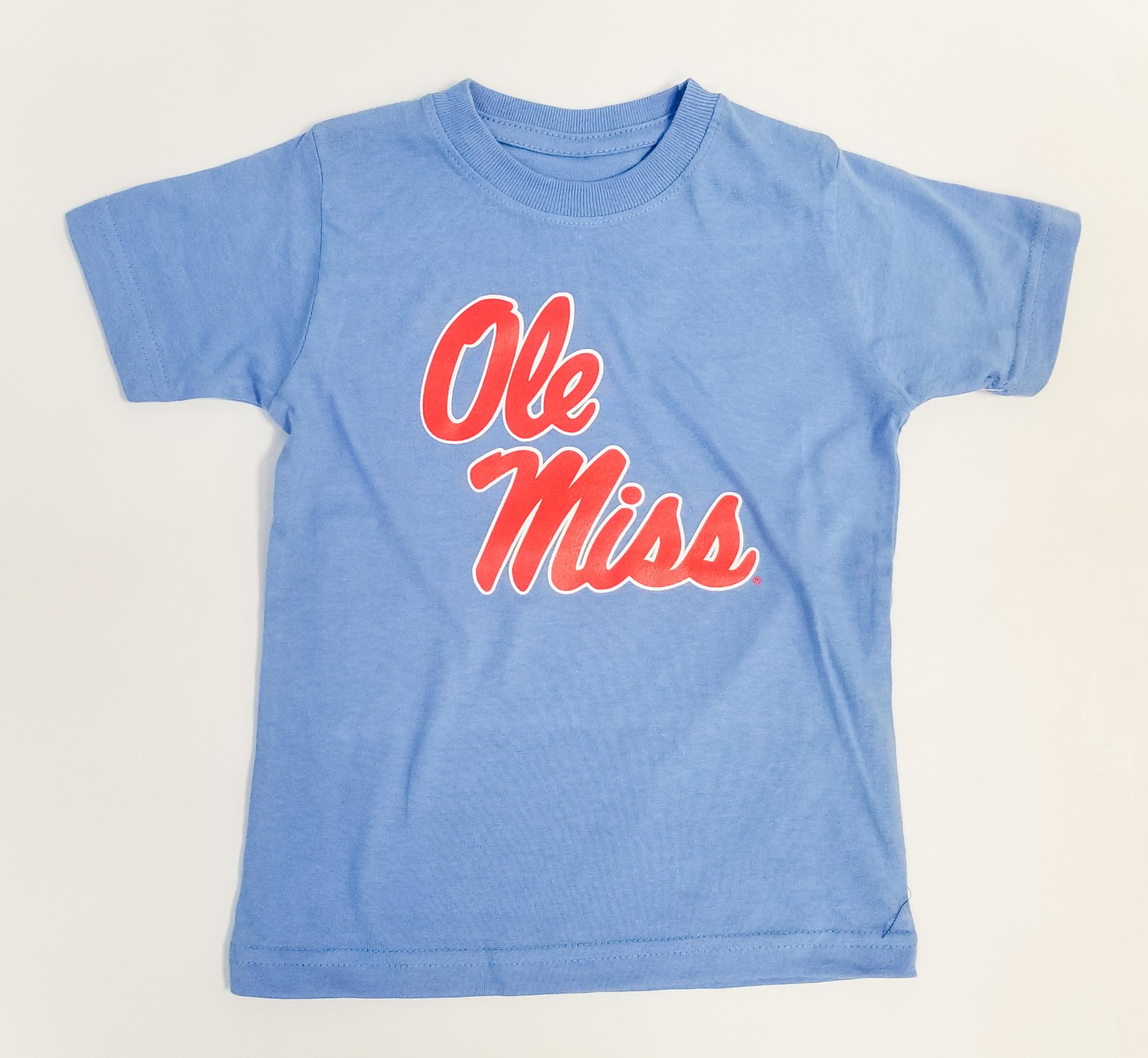 Soft 100% cotton. Great Ole Miss script basic tee for smaller fans. Available in Carolina blue and navy.