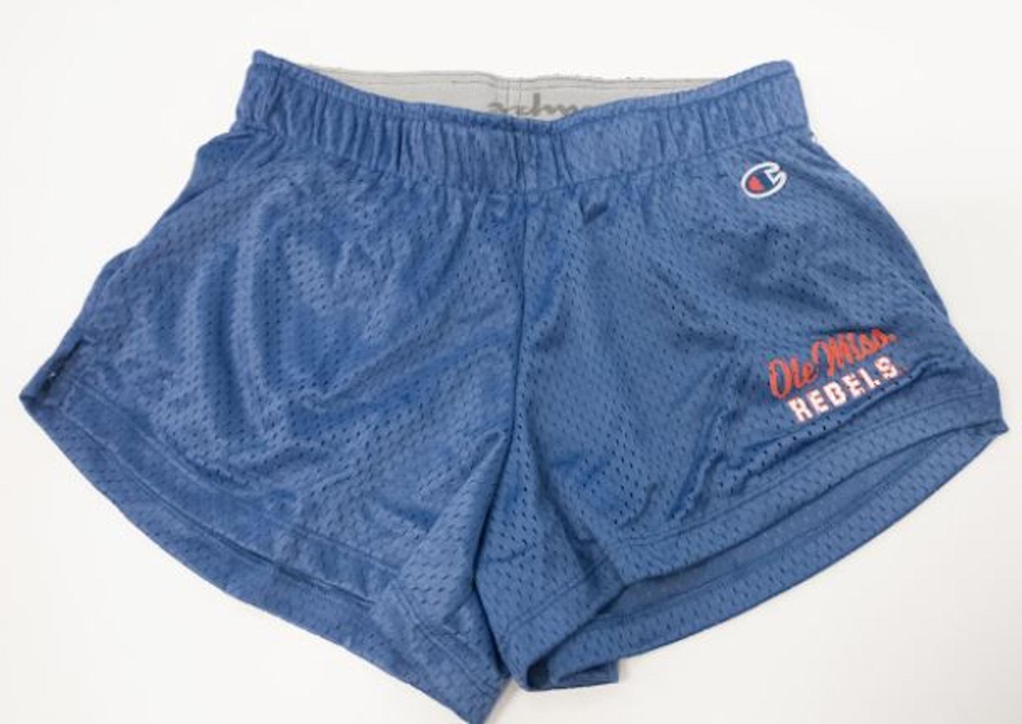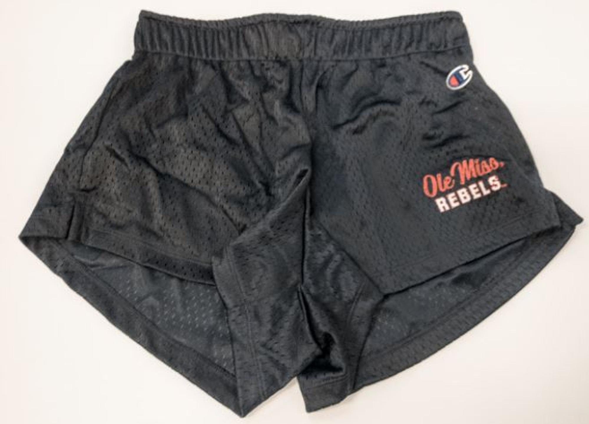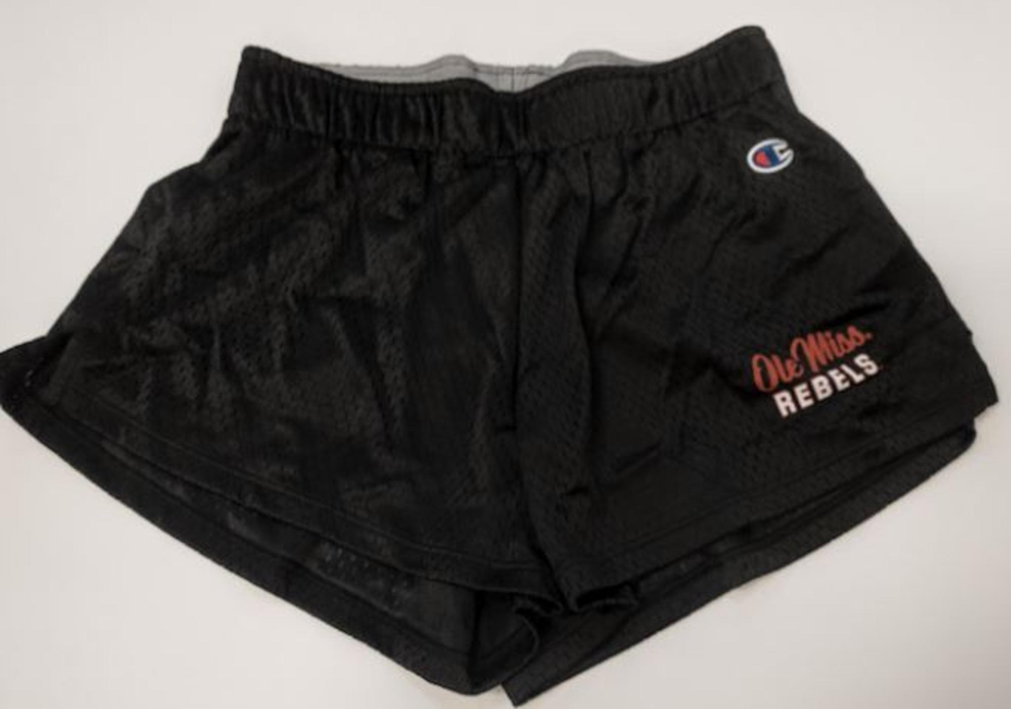 100% polyester. Constructed with a mesh outer layer backed by a solid interior layer. (These shorts do not have a built-in liner.) The waistband can be folded down to display the wide interior elastic band with the Champion logo. Whether studying or walking to class, these Ole Miss shorts are an easy wardrobe option.