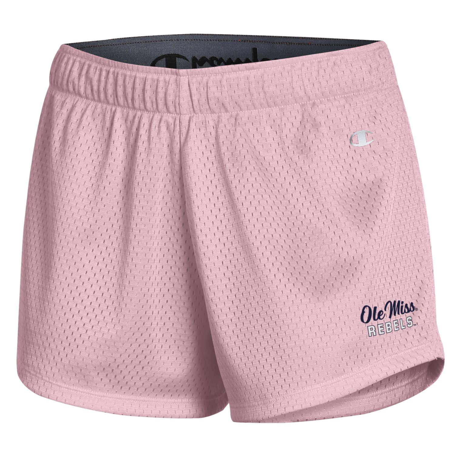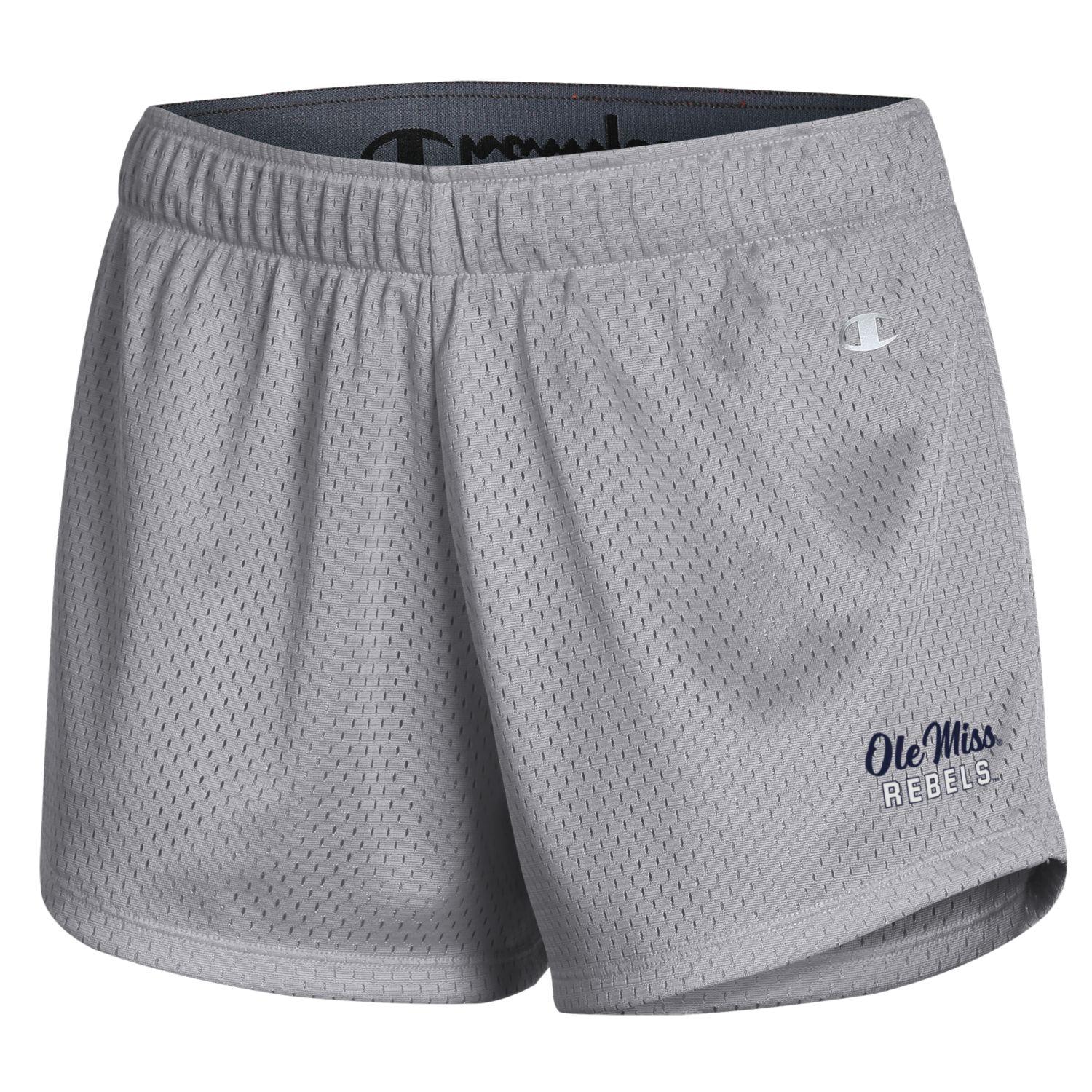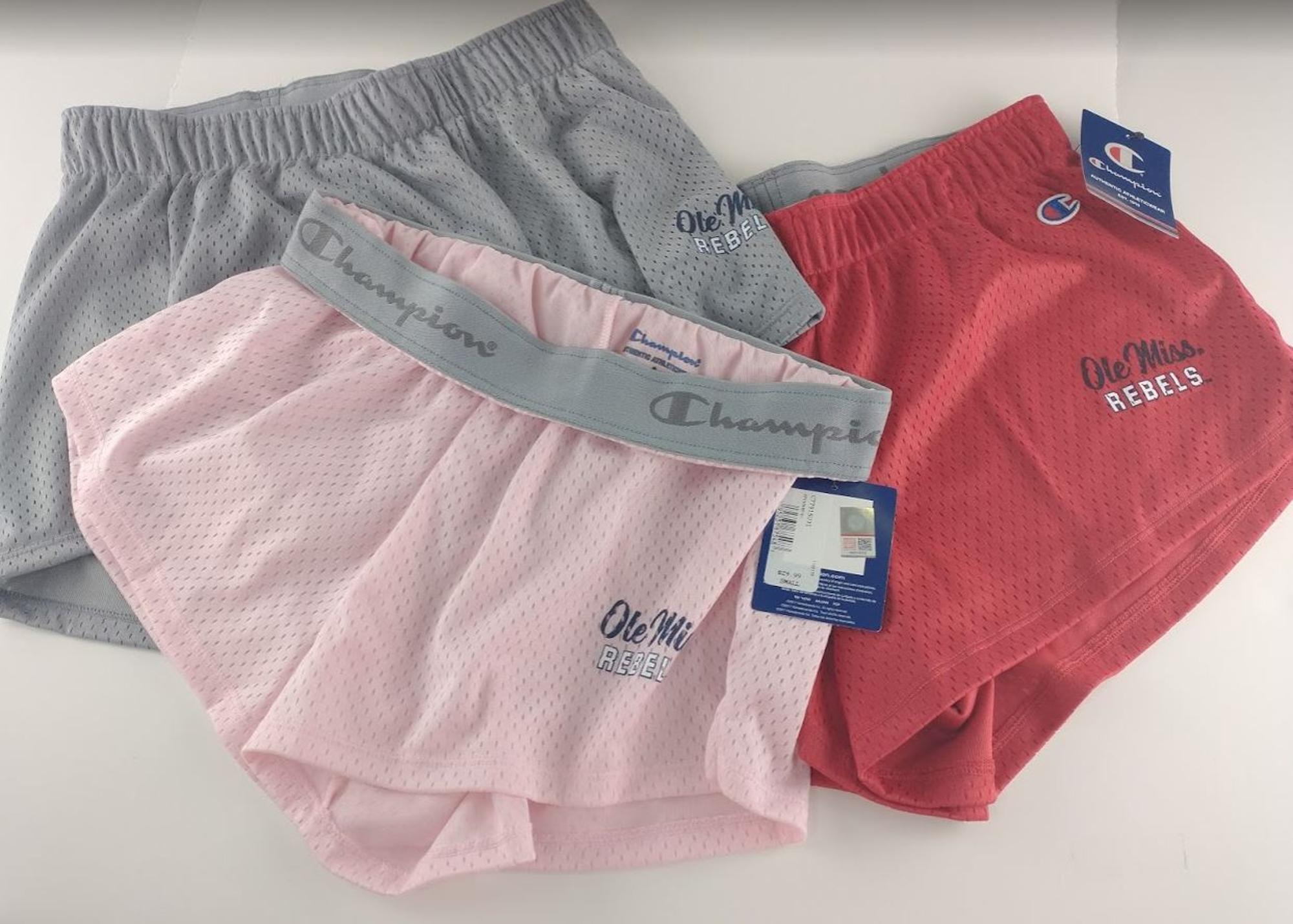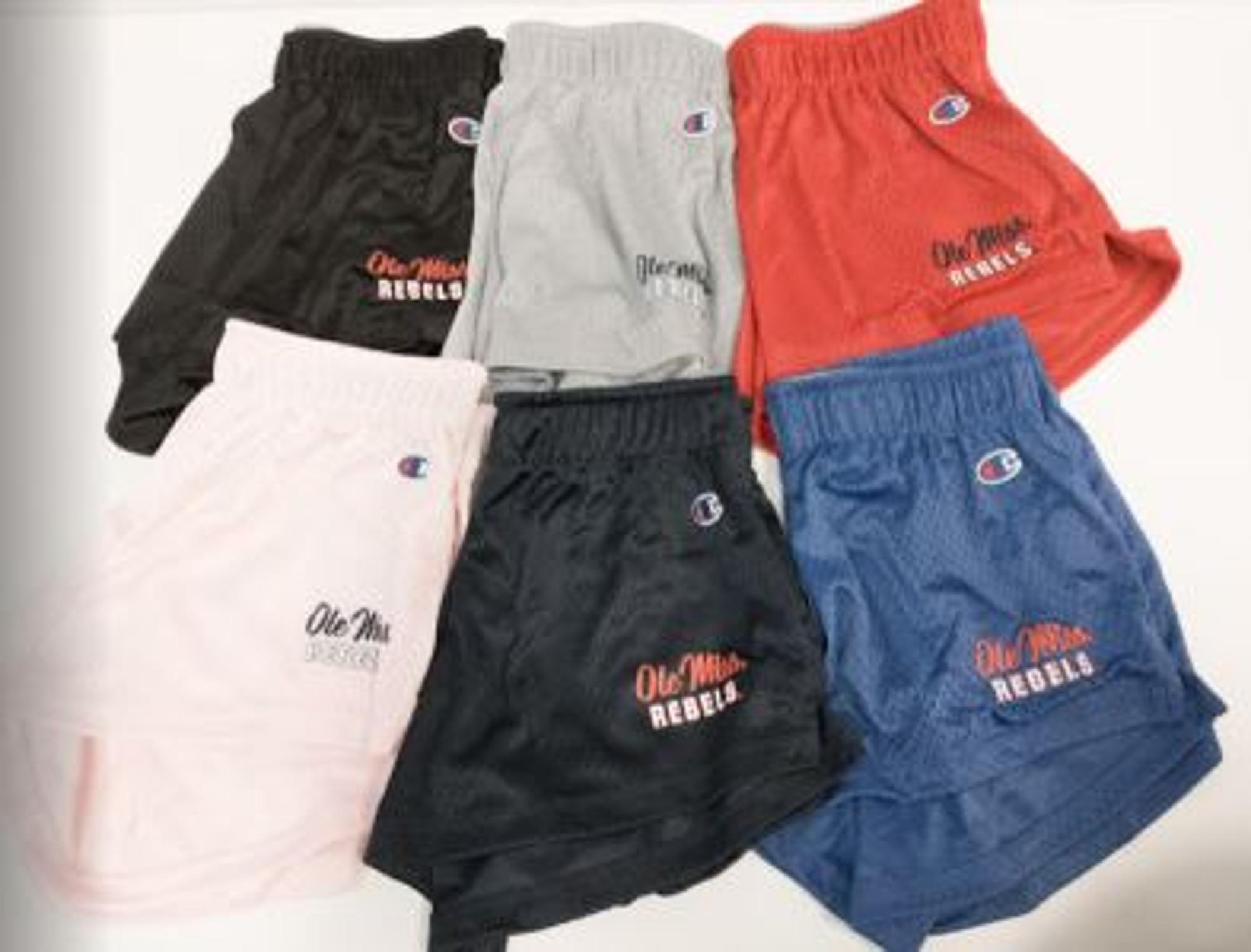 100% polyester. Constructed with a mesh outer layer backed by a solid interior layer. (These shorts do not have a built-in liner.) The waistband can be folded down to display the wide interior elastic band with the Champion logo. Whether studying or walking to class, these Ole Miss shorts are an easy wardrobe option.