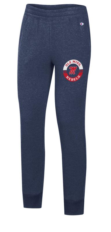 50% polyester, 38% cotton, 12% rayon fleece. 2x2 rib at cuffs. Encased elastic at waistband. 28" inseam. Art is 3.5" in diameter. Sized for female Ole Miss fans.