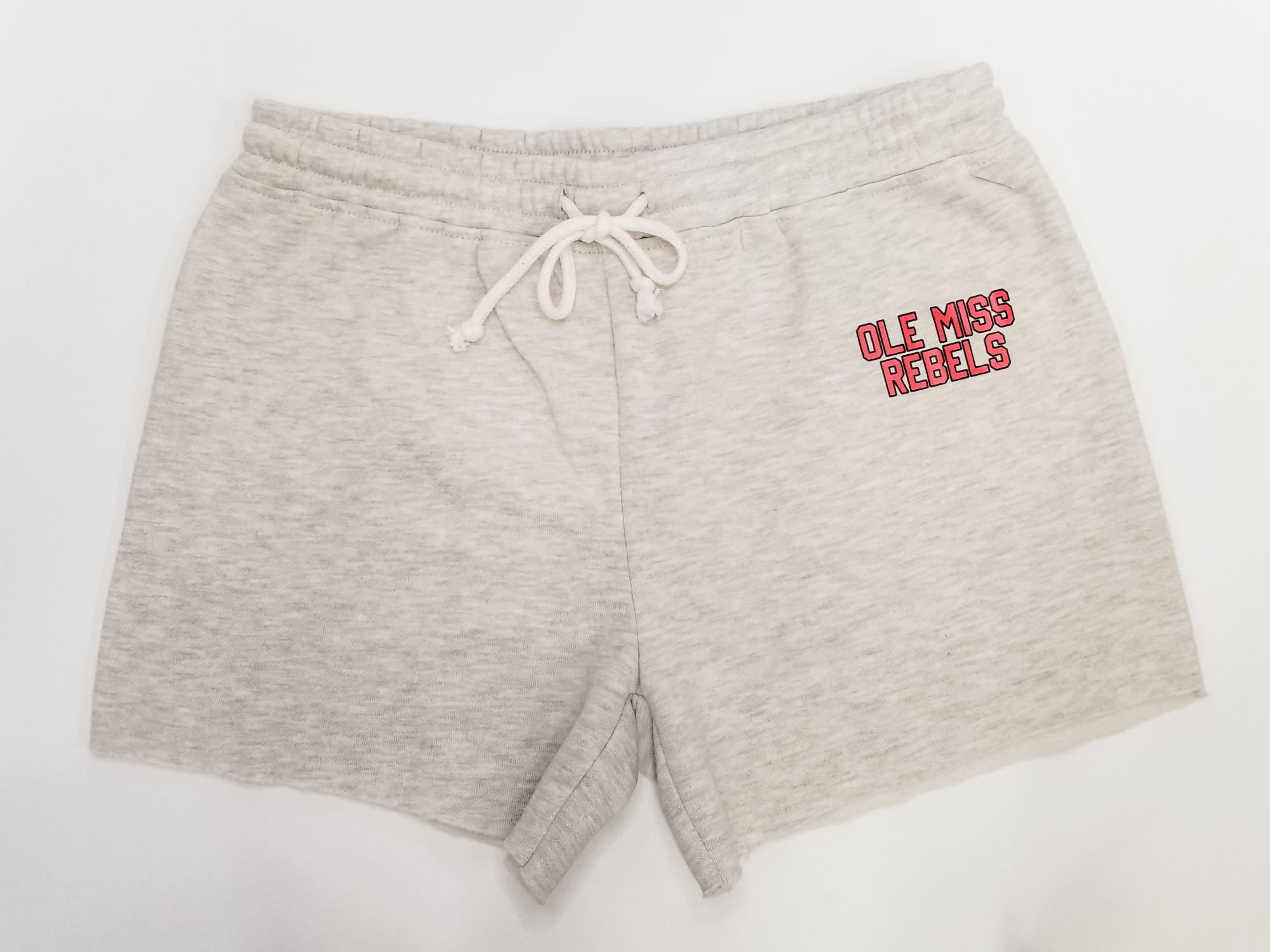 60% cotton, 40% polyester. Oatmeal/grey heather. Everyone needs good basics. This wear-anywhere knit fabric is ultra soft and comfortable for a relaxed, easy feel. Elastic waist with cord drawstring. Raw edges at the legs. Ole Miss Rebels printed high at the left hip.