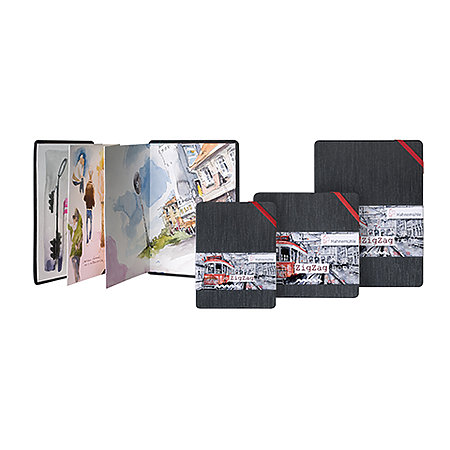 ZigZag watercolor books feature fine-grain watercolor paper folded in an accordion style, ideal for urban sketchers and creators on the road for all wet painting techniques. The stable 140 lb. (300gsm) weight and surface sizing allows colors to flow and lift without problems. Paper is eraser-resistant and easily remove masking fluid and tapes residue-free. A durable, rugged, oversized book cover and red band helps to protect contents. 18 panels per book.